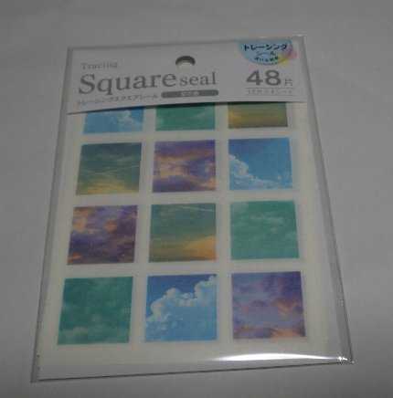 100均でみつけた「トレーシングスクエアシール 空の色」エビスマーケット。12片×4シートで48片。透ける質感。