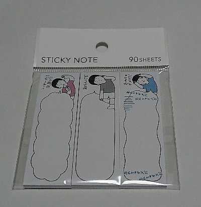 100均でみつけた「付箋 テキトー君」キャンドゥ。30枚×3本。「ハァーイ!!注目ゥ!!」「知らんけど」「忘れちゃダメだ!!」