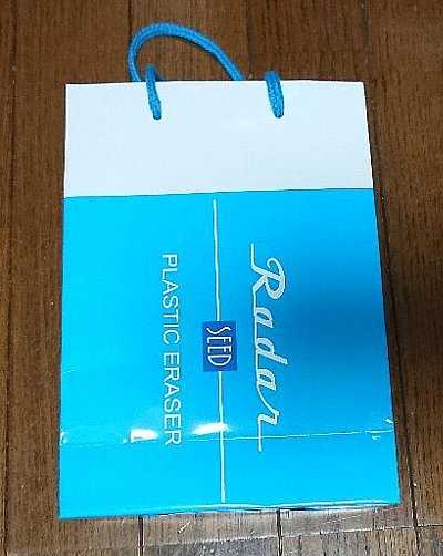 100均でみつけた「文具メーカーシリーズ ペーパーバッグ レーダー消しゴム柄」ダイソー。
