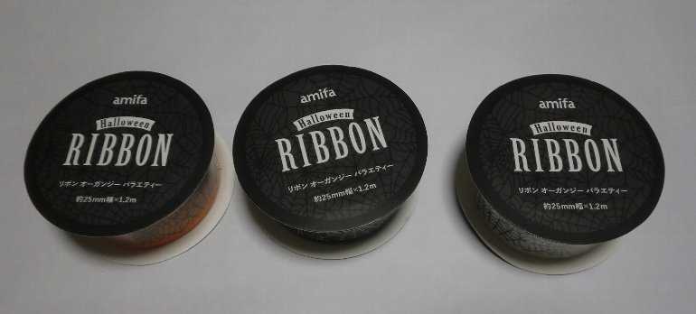 100均でみつけた「リボン オーガンジーアソートハロウィン」ダイソー。25mm×1.5m。