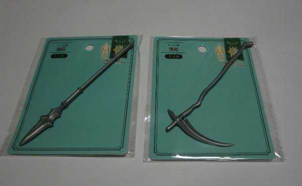 100均でみつけた「ダンジョンシリーズドル活 ドール用 武器」セリア。全4種類。槍・釜・斧・弓矢。