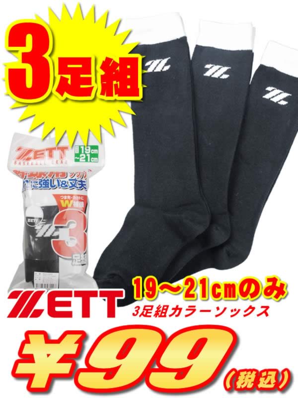 いつも履いている靴下・・すごく頑丈です。これがこんな値段って・・・すごい・・これほしさに色々買ってしまった ブラック・19~21cm限定!92%OFF!お得な3足組♪破れに強い&丈夫!つま先・カカトW補強! ZETT(ゼット) 3足組ベースボールカラーソックス ジュニア用 BK3CSKM/BK3CMKM【あす楽対応】