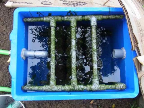 昨日作ったパーツを取り付けて、いよいよ第2池濾過槽が本格稼働し始めました。ポイントは濾材の間隔を空けて、水の通りをよくしたこと。そして吸水口を解放して、あえて乱流を起こさせ、濾過槽全体に水流を作り出すこと。すべて「活性汚泥法」と呼ばれる、下水処理施設で用いられている汚水処理システムに準拠して、それをこの小さなコンテナボックスの中で実現することを目指しました。メインテナンス性もよく、掃除の時には中の濾材を一体として引き出して、中にたまった汚泥を掬い出すだけでOKです。これから1週間はエサ切りの状態。そして透明度がどの程度改善するのかしないのかを追跡します。さあ、第2池もいよいよこれからが勝負です!(黒いロールフィルターが均等に、そして隙間を空けて配置されました。ここに水流を作り出すことで濾過効率アップを狙っています)(今はまだこんなに濁っている第2池。これがどこまで透明度が上がるのか・・・勝負です)*へぇ~とか、うんうんと思われたら、こちら↓をポチッとおねがいします!*にほんブログ村