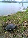 今日もいつものように、ウォーキングをしていたら、また陸地にカメさんが。 一度通り過ぎたんだけど、なんだか気になって引き返しました。よく見ると、カメさんのおしりのあたりに穴があいてる! 後ろ足を上手に使って、どんどん穴を掘るカメさん。「これは、もしかして、産卵してんの?!」と、私も脇に座り込み、観察。穴を掘るときは後ろ足、一本だけを使って他の足は踏ん張り足のひれをスコップのようにしています。しょっちゅう、後ろ足、左右交代させなから。で、穴掘りが終わったな~とノンキに眺めていたらしばらくして、今度は両足で穴を埋め始めた!卵見れず残念(><)でも、その穴の埋め方が、職人技だった!!!今度は両後ろ足を使って、穴に土を入れて、それを足の甲でトントントンっと固めていく作業を延々と・・・。 穴掘りから産卵までは15分ぐらいだったけど、この穴埋め作業、30分続きました(^^;)足の動きは、まるで人間の手のよう!職人さんが、粉をこねているようなかんじ。カメの後ろ足があんなに器用だったとは、驚きでした。後ろ足でやるから、カメさんは、穴の様子を見えないのにまるで、オシリに目がついているかと思うような完璧な仕事ぶり・・・。あんまりていねいに埋め続けるので、私は心の中で「もういいってば!もう充分!」と言い続けつつ、ここまで見たのに、途中で帰るわけにも行かなくなってしまいました~。最後は、芝やら落ち葉を、これまた後ろ足で土の上に広げ穴があったのがウソのようになりました。ここまでやるとは!!! さすがにここまでやったら、とても疲れたらしくすごく息が荒くなってました!ハアッハアッって。ほんとに!息がおさまったところで向きを変え、何事もなかったかのように、池にむかうカメさん。 お疲れ様~!私が横でじ~っと見てたから、うっとおしかっただろうな(^^;)一部始終を見て、なんだかすごく感動しました~・・・。野生の本能って、すごい・・・。あたりまえのことなんだろうけど、これが本来の生き物の姿なんだ~ってすごくじ~んときちゃいました。朝からいいものを見せてもらいました!ありがとう、カメさん!!!最近はウォーキングの時、携帯はジャマだから持って行かないんだけど今日は、なぜか、携帯もってかなきゃ!って思って手に握り締めて行きました。こういうことだったんだ~。