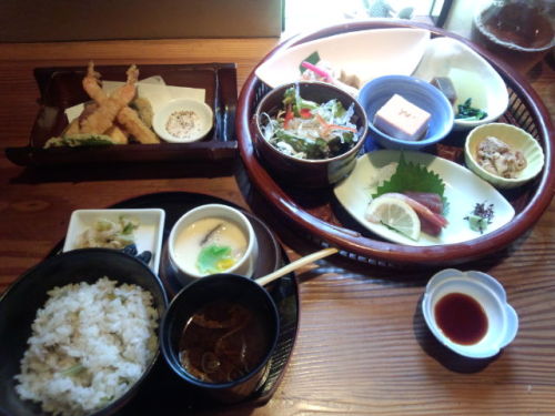 水曜日は、ぐるなびポイントの超得の日1000ポイントキャッシュバックされるので、下と一緒にランチに出かけました。ポイントを使えるお店が限られているから『わしょく屋』へ先々週利用したので、内容が一緒だから…おてごろランチにしました。天麩羅かお刺身のどちらかに前菜、サラダ、焼魚、炊き込みご飯、吸い物、茶碗蒸し、漬物のセットです私が天麩羅、下がお刺身を注文しました。 天麩羅のセット天麩羅は、海老2本、なす、カボチャ、ししとう、さつま芋お刺身の方は、マグロとサーモンでした。 ランチタイムは、ご飯のおかわりができます。 どちらのセットも1200円ですが、天麩羅の方がボリュームがあっていいかな? わしょく屋は、結構お気に入りなんですが…メニューがほぼ一緒なので、月に1回位の利用がベストなんだけど… ただで食べられるからってことでちょくちょく行ってしまうかな?
