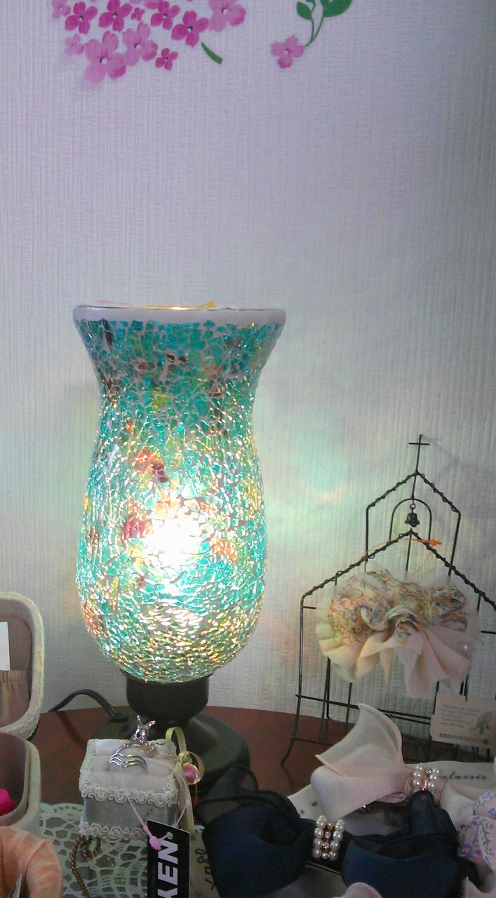 ブルーグリーンの色味で個性的なデザインのランプです