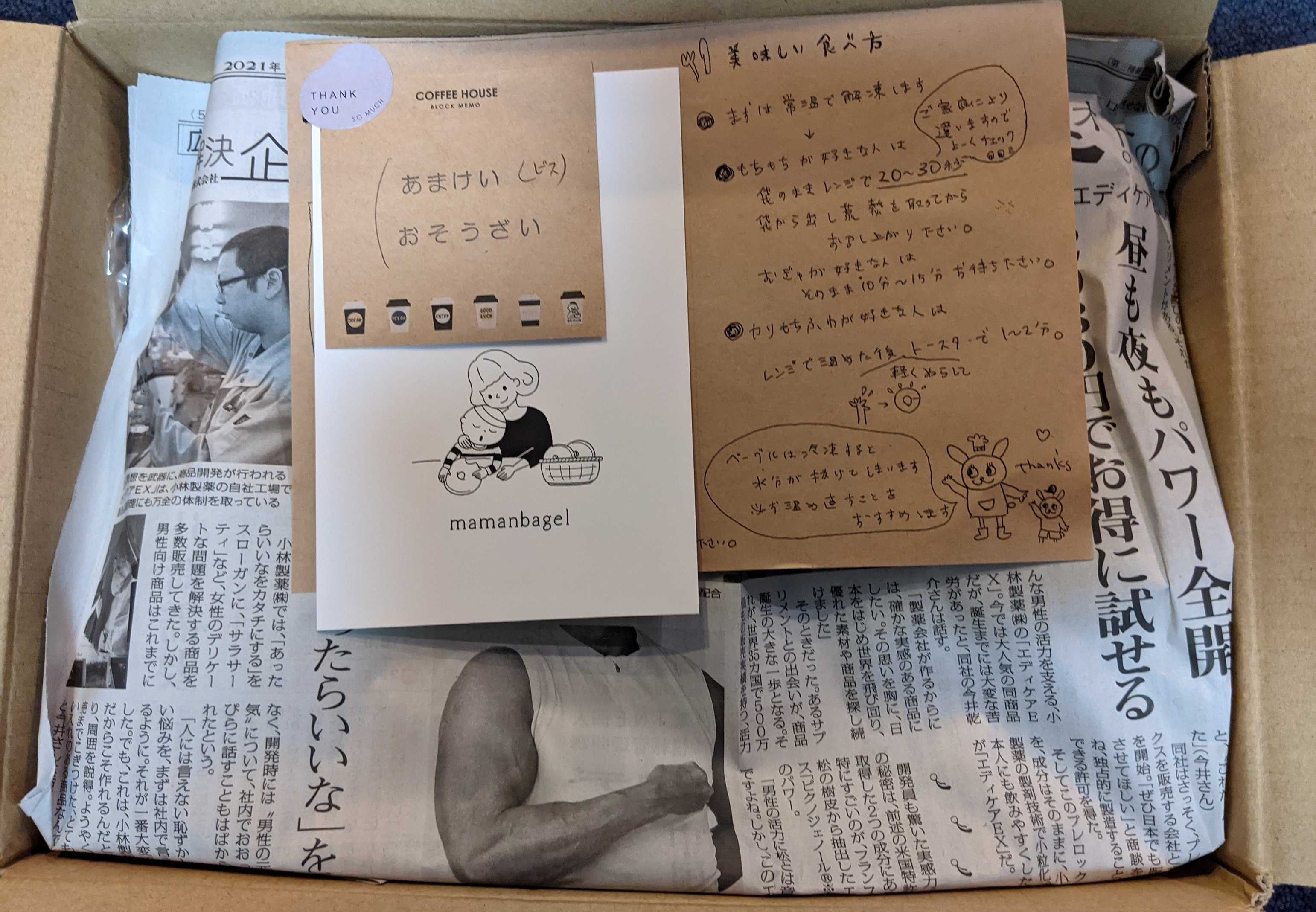 安定で美味しいママンベーグルさん(通販のみのベーグル屋さん)9回目のお取り寄せ~甘系10個にビスケット入り(3051円)とお総菜メイン10個(2800円)(+クール便送料)↑いつも通りの上毛新聞。中のベーグルも上毛新聞で甘系とお総菜系に分かれていました。お総菜系○ベーグルドッグ○じゃがチーズ○ひきにくたまねぎ○めんたいちーず○ほうれん草べーこんちーず○しおばた○Wチーズ○ぐらたん○プレーン○ミルクフランス甘系+ビスケット○あんずくるみ○きゃらめるあーもんど○くるみオレンジクリチ○あんバター○くさもち○桜くりち○しょこらだまんど○ティラミス○プレーン○ミルクフランス●ビスケットが入っていました盛りだくさんで冷凍庫満タン〇桜くりちレンチン→少し焦げるくらいリベイクしていただきました。表面カリっと、中はママンさん独特の強めのもっちり感。ママンさんの生地はどうしてこんなに美味しいんだろ優しい甘味の桜あんは、白隠元豆がまるまる残ってて豆の風味豊か、そして生地にも桜あんにも塩っけのある桜葉が刻んで入っていて、合わさると甘じょっぱい。そこにまろやかな酸味のあるクリチが合わさると美味しちょこちょこ入っているくるみが良いアクセント。4月便の1品目も安定の美味しさで、好みでした〇キャラメルアーモンドレンチン→半割してから少し焦げるくらいにリベイクしていただきました。キャラメルがとろーっと出て来て、トースターにこぼしてしまったでも美味しいもっちり生地にちょうどいいほろ苦さのキャラメルがたっぷりで大き目のアーモンドと噛むと美味しいママンさんの定番の中でも、これとミルクフランスとくるみ味噌とティラミスとあんバターあたりが特に好きだな~〇ミルクフランス自然解凍→リベイクしていただきました。相変わらず激ウマ。。。いい感じにリベイク出来て、生地は表面カリっと、中はもっちゅり。そしてミルククリームは、内部にジャリジャリ食感を残しつつも、一部とろけて生地に甘味がしみ込んで美味し~カロリー爆弾だろうけど、これは何回でも食べたい〇じゃがチーズ自然解凍→少し焦げるくらいにリベイクしていただきました。表面のチーズは香ばしく生地と一緒にカリッと、中は具の水分もあってもっちゅり感がいつもよりもアップしていて美味しい食感。角切りのジャガイモがちょっと残りつつマッシュされたジャガイモとチーズがたっぷりと入っていて、ねっとりとしていて美味し~〇ティラミス冷蔵庫解凍でいただきました。むぎゅーって詰まった生地を齧ると、ココアの香りにコーヒーの香り…コーヒー(リキュール?)の風味がするまろやかチーズ(クリチ?マスカルポーネ?)とカリッと食感のビターチョコが美味しい甘味がありつつも、大人なバランス〇草もち自然解凍→リベイクしていただきました。もちもちの生地はすごくよもぎ香りも味もヨモギもちもちの生地によく合っていて美味し。表面には香ばしいきなこ、中には粒のしっかりした粒あんと柔らかお餅が溢れんばかりに。草餅食べているみたいこれも美味しかった~〇ショコラダマンド自然解凍→リベイクしていただきました。表面のダマンド生地はフワっと感がありつつサクホロっと、そして中はもちっと。甘さひかえめココア生地の中にたっぷり入ったビターチョコがとろけて美味し。チョコ好きだからこれも大好き〇あんバター自然解凍→中身を取り出してリベイク→挟みなおしていただきました。カリッとしてじゅわ~っと。早く食べないとバターがポタポタ。何度食べても上手に食べられないけど、美味し溶けたバターがジュワジュワで、餡子の甘さにぴったりで、生地はカリッとモチっと。ボリュームがしっかりあって満腹度も高いです〇グラタン自然解凍→少し焦げるくらいにリベイクしていただきました。具沢山なベーグルは、しっとりした具のおかげでもっちょりの美味し過ぎる食感!ハムに、炒められて甘い玉ねぎ、ブラックペッパーがいい仕事。チーズとホワイトソースで適度な塩っけがあって、美味しかったです〇ベーグルドッグ自然解凍→リベイクしていただきました。もちもち生地にパリッとしたソーセージの組み合わせ…美味し表面のチーズが香ばしくてまたいい感じただ、生地からはみ出たソーセージが乾燥しちゃっているのがちょっと残念。写真撮り忘れましたが、クッキーもガリガリとして美味しかったです。3歳の息子は、プレーン、wチーズ、塩バター、オレンジくりち、あんずとくるみを食べて、Wチーズや塩バターが気に入ったようでした。主人は、ひき肉玉ねぎ、めんたいちーずを食べて美味しかったそう。あっという間に無くなっちゃった。ごちそうさまでした。mamanbagel(ママンベーグル)https://www.instagram.com/mamanbagel/https://www.mamanbagel.com/【送料無料】 ベーグル 蒟蒻40%以上配合の手作り 国産 こんにゃく ベーグル 25個セット 【5個セット×5種】 福袋 詰め合わせ パン 蒟蒻ベーグル 送料込 ダイエット 美味しいカロリ