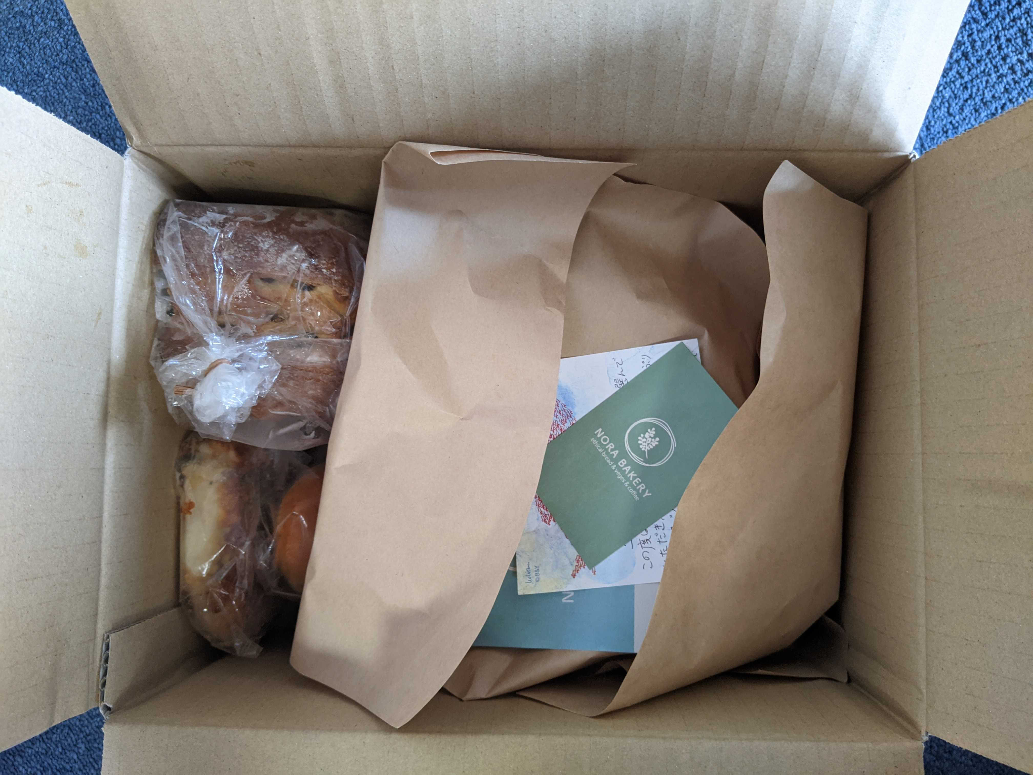 rebakeで東京・多摩川にあるNORA BAKERYさんをお取り寄せしてみました。ぶーるぶーるぶらんじぇり、石窯パン工房ハイジさんに続いて3店目。今回は6月17日に注文して、6月24日に発送連絡、今日届きましたNORAのこだわりパンおまかせセット(2000円+送料)〇カルダモンロール〇クララの白パン〇チュンチュン〇プレッツェル〇ゴルゴ〇カンパーニュ〇トマトとソーセージ〇まんまるレーズンパン〇レーズンブレッド〇バケット〇ノランジェ小ぶりなパンを中心に11種類入り。食べたかったカルダモンロールが入っていて嬉しい他も子供や主人も食べられそうな我が家向きの良いラインナップ〇カルダモンロール自然解凍→リベイクしていただきました。ふわしっとり生地に、カルダモンしっかり香るちょうど良い甘さで美味しいです。〇クララの白パン自然解凍→リベイクしていただきました。ふわりとしっとり、ちょっともっちり。白パンらしい淡白な感じだけど、噛むと優しい甘味もあって美味しい。〇チュンチュン自然解凍→リベイクしていただきました。名前が可愛いなぁ。どういう意味なんだろう?リベイクで外はカリッと、中は詰まった感じ。ドイツのプレッツェルみたいに表面に塩っ気があって中は蛋白だけど、なんとなく旨味があって美味しい!ケシの実のアクセントがいい。〇プレッツェル自然解凍→リベイクしていただきました。昨日食べたチュンチュンと似ている。表面に美味しい塩っ気があって、中は蛋白な感じ。細いところがポリポリになってて美味しい。〇カンパーニュ自然解凍→リベイクしていただきました。酸味があるけど、薄切りで軽さがあって美味しい表面の香ばしさもいい。薄切りだから、焼くとカリッとなる。もう少し厚切りも試してみたいなぁ…。〇バケット自然解凍→カットしてリベイクしていただきました。息子はチーズをのせて、私はハムチーズレタスサンドで。全体に柔らか系で、表面もしっとり。でも香ばしさとちょうどよい塩っけとうまみがあって美味しい。〇ノランジェ自然解凍→リベイクしていただきました。しっとり旨味のある生地に甘酸っぱいレーズンやカレンツがいっぱいくるみのコクが加わって間違いない美味しさ。今回食べた中では、これかカンパーニュ、プレッツェルが特に好きだったかな。まんまるレーズンパンとレーズンブレッドはレーズン好きの3歳息子が一人で食べちゃいました。私が食べるつもりだったゴルゴ(ゴルゴンゾーラ、はちみつ、くるみ、モッツアレラのパン)も息子1人で食べてすごい気に入っていました。子供向きじゃない感じだけどクアトロフォルマッジョ好きな子だからなぁ。。。トマトとソーセージは主人が食べて、全部美味しくいただきました。ごちそうさまでした!!NORA BAKERY(ノラベーカリー)東京都大田区田園調布1-55-10https://www.instagram.com/norabakery_tamagawa/冷凍パン 詰め合わせ セット 11個の訳ありパン 送料無料 ギフト ロスパン 福袋