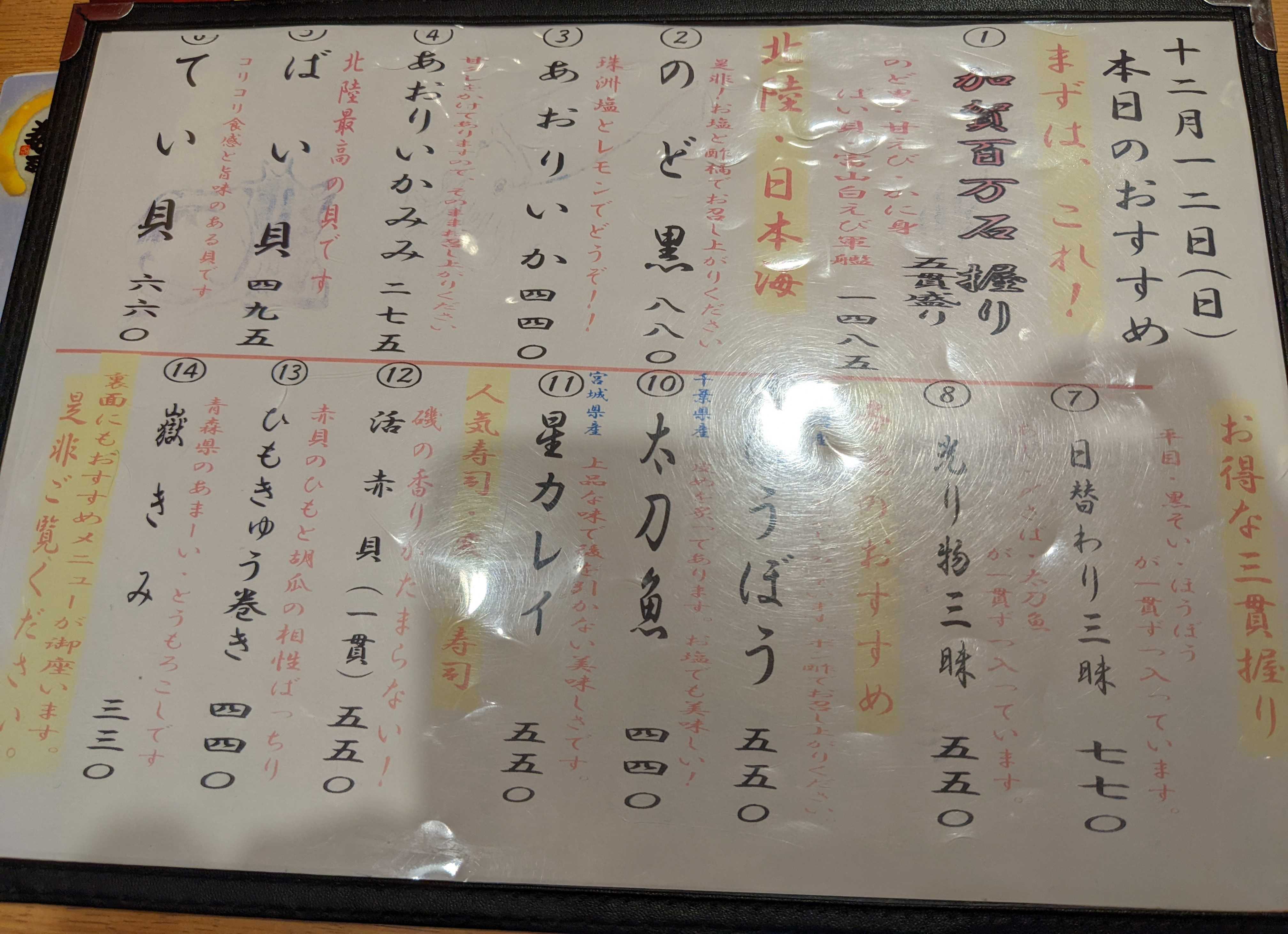 息子がイオンモール幕張新都心に行きたいというので車でやってきましたトイザらスを見てから、ランチは金沢まいもん寿司へファミリーモールからグランドモールの端っこは遠い…しかも結構行列。せっかく来たから待つけどさ。30分ちょっと待ちました。美味しそうなものが一杯のメニュー冬のメニューにも美味しそうなものが一杯食べられるうちに食べておきたい香箱ガニもちゃんとある香箱蟹軍艦(990円税込)あれ~カニの殻が無い…まぁいっか。去年のブログを見ると840円(+税)だったから、値上がり…。まぁたまの贅沢しょうがないよね。美味し加賀百万石握り(1485円)光りもの三昧(550円)太刀魚、あじ、サバ白子軍艦(605円)やっぱりお寿司はちょっと寒くなってきてからのが好きなネタが増えて美味しいなぁ~3歳息子くんは、いつも通り納豆巻きとアサリの味噌汁のみ。親が贅沢をしてしまっているのに経済的でありがたいwごちそうさまでした。金沢まいもん寿司 イオンモール幕張新都心店千葉県千葉市美浜区豊砂1−1 イオンモール 1階 グランドモールhttps://www.maimon-susi.com/まとめ買いクーポンあり!大間のマグロが抽選で当たる【送料無料】絶品6品入り海鮮福袋 本マグロ大トロ、目鉢まぐろ中トロ、ウニ、イクラ、ネギトロ、づけ(ギフト お歳暮 御歳暮 お年賀 プレゼント 海鮮丼 手巻き寿司 刺身 om22)《not-st1》〈st1〉yd5[[海鮮福袋]
