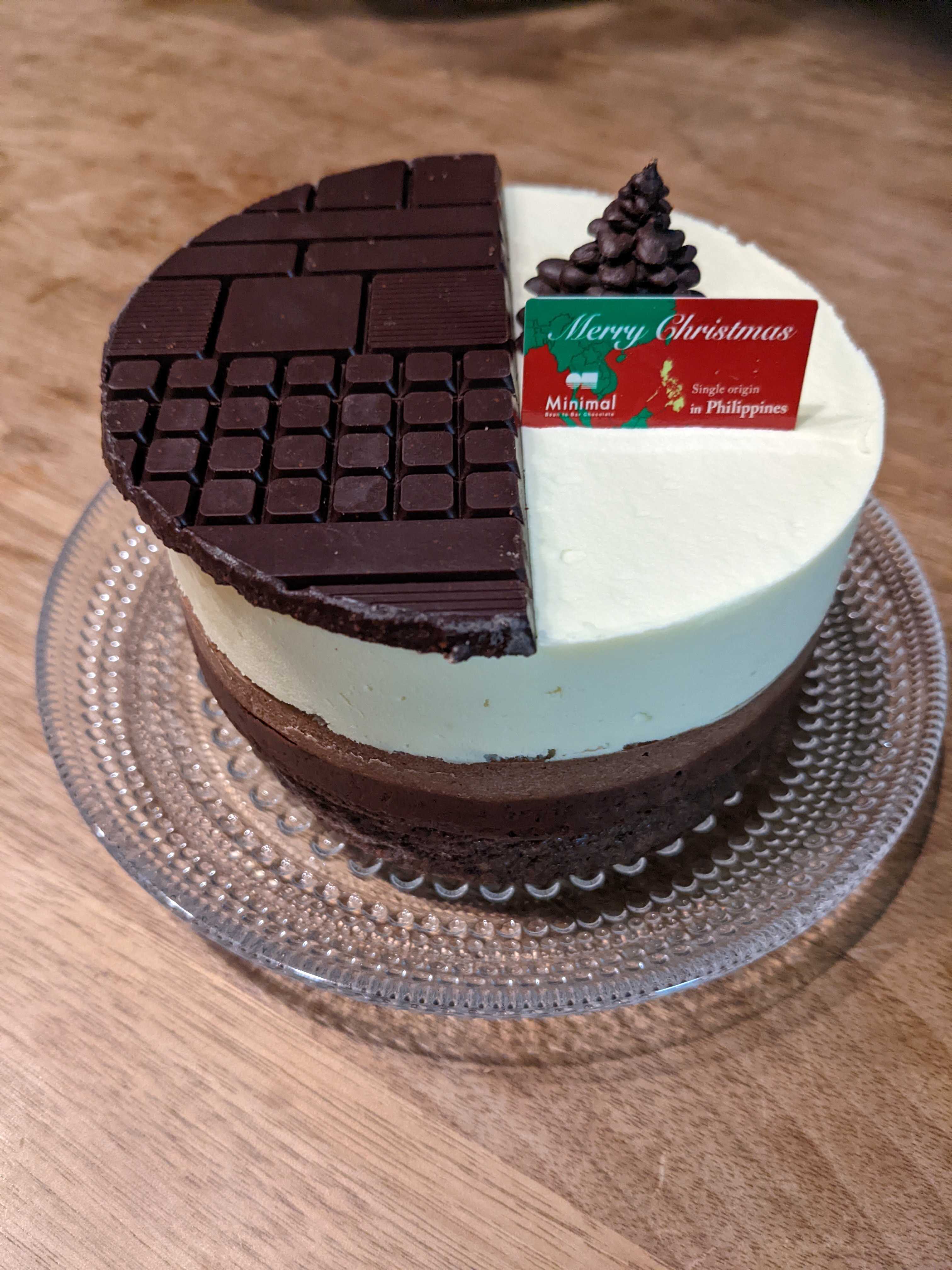 今年のクリスマスケーキはMinimal – Bean to Bar Chocolate – (ミニマル)にしました。自宅配送が出来て、主人が苦手な果物系じゃないやつ、出来たらチョコレート系と言われて決定。洋なしがちょっと入っているけど梨は好きだし、ちょっとだからいいということ。Minimal クリスマスケーキ -2021-(5400円+送料)昨日24日に届けてもらったので、しっかりと冷蔵庫解凍をして。板チョコとツリーとプレートは自分で載せました。上から 🎄板チョコレート(カカオ濃度70%、フィリピン産)とチョコレートのツリー🎄ホワイトチョコレートムース🎄ビターチョコレートムース🎄洋梨とチョコレートのガナッシュ(カカオ濃度80%)🎄生ガトーショコラ(カカオ70%)という構造だそう。全部チョコなのに、全部違って美味しい生ガトーショコラもカカオの粒つぶが感じられて他とは一味違う面白さ。↓原材料を見ても気になる添加物も入っていません。なので、今年からは3歳の息子もケーキを食べました。最初に写真撮る前に板チョコを全部奪われたけど、パパとママも食べるからと死守😂ツリーと板チョコ半分とケーキ15度くらい食べました。この前に大きなチキンも食べたのに、よく食べるなあ。全体的にビターで大人好みなのに、「おいしい」と満足気。一番甘めに感じたホワイトチョコムースも、スッと溶ける感じでしつこさが無くて、美味しかったです。ごちそうさまでした。直径12cmは3人で分けてちょうど良い大きさでした。ちょっと高いけどねぇ。Minimal – Bean to Bar Chocolate – (ミニマル)東京都渋谷区富ケ谷2丁目1−9https://mini-mal.tokyo/https://www.instagram.com/minimal_beantobarchocolate/テリーヌショコラ 1本 送料無料 冷凍 ガトーショコラ ショコラ テリーヌ お取り寄せ プレゼント スイーツ ギフト チョコ ケーキ チョコレート 生チョコ 内祝い クリスマス Patico 【a】