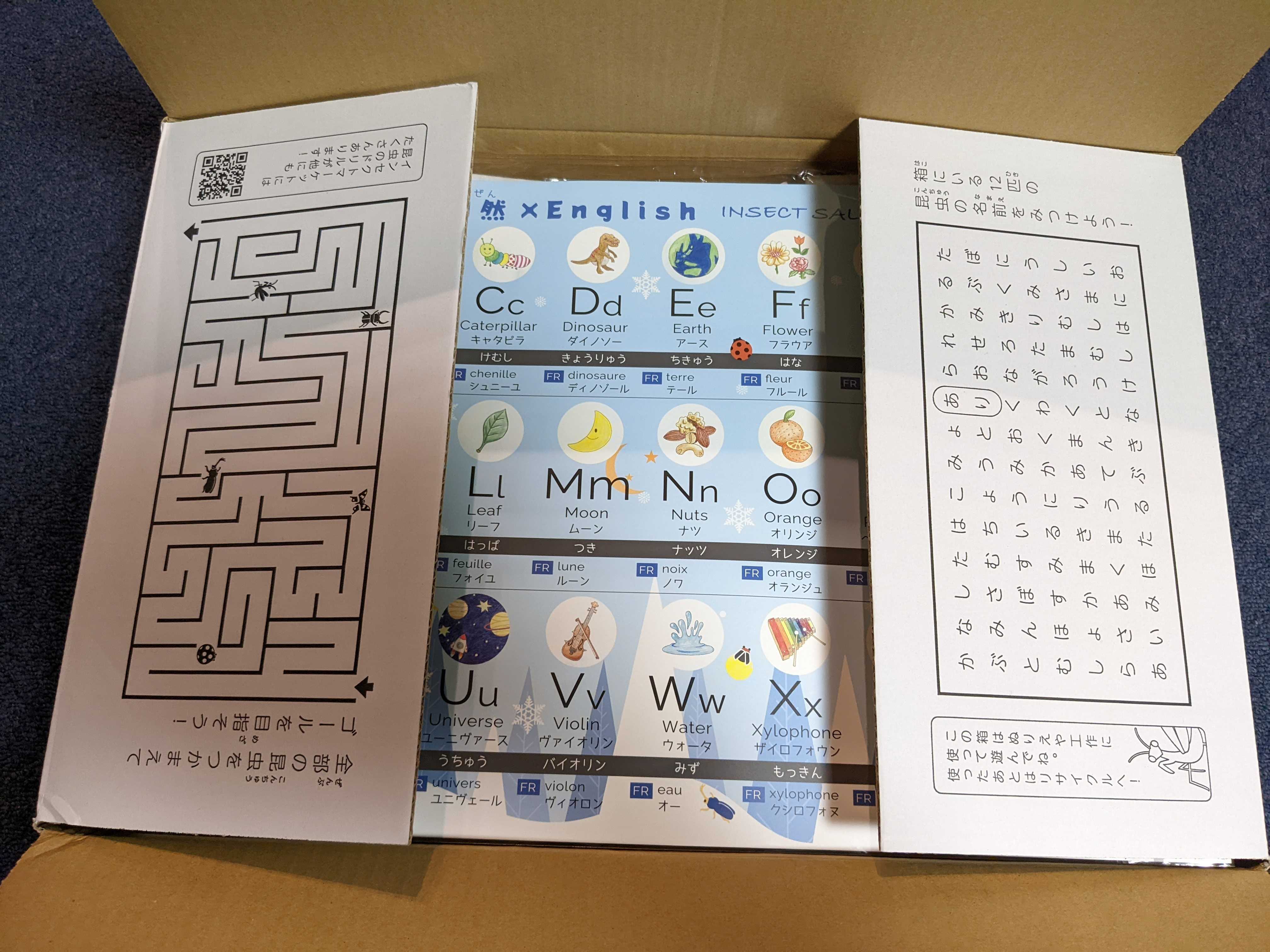 12月13日に注文したInsect Collectionの福袋、むし箱2022 こども(年賀状+ノベルティ付)Lサイズ(10000円送料込み)が届きましたLサイズは翌日に見たら売り切れていたから早めに買えて良かった段ボール箱も、迷路と単語探しゲームが書いてあって素敵年賀状とノベルティ付きノベルティはお風呂で学べるアルファベット。ひらがなとカタカナは覚えてきたからちょうどいいや。中身はこんな感じ。〇インセクトランドの仲間たちの原っぱ仲良しブランケット(3500円)〇ほたるのアダムリュック(5500円)〇ほたるのアダム防災頭巾(3500円)〇昆虫デザインモノグラムポーチ(3500円)〇カマキリくんセーター(3800円)〇KODOMO Nombre プリント100%再生ペットボトルTシャツ チョウ9 blanc(3500円)〇DisneyデザインTシャツ<Mickey&Grasshopper> オーガニックコットン使用(4000円)〇せみTシャツ オーガニックコットン使用(3300円)〇太陽に当たると昆虫大脱走Tシャツ ホワイト オーガニックコットン使用(3500円)〇回転式セーフティピン刺繍ブローチ(350円) ×2(クワガタとセミ)〇暗いところで光る!蓄光ホタルのピカピカ日本製マスク イエロー(640円)〇Nombre ナンバーチャーム カマキリ3(3300円)欲しかった、カマキリ君セーター、太陽光で光るカマキリTシャツ、セミTシャツが入っていて嬉しいみんな触り心地が上質で着心地が良さそううちの3歳児には大きすぎるリュックと、あまり使わないチャームやブローチがちょっといらなかったが概ね満足