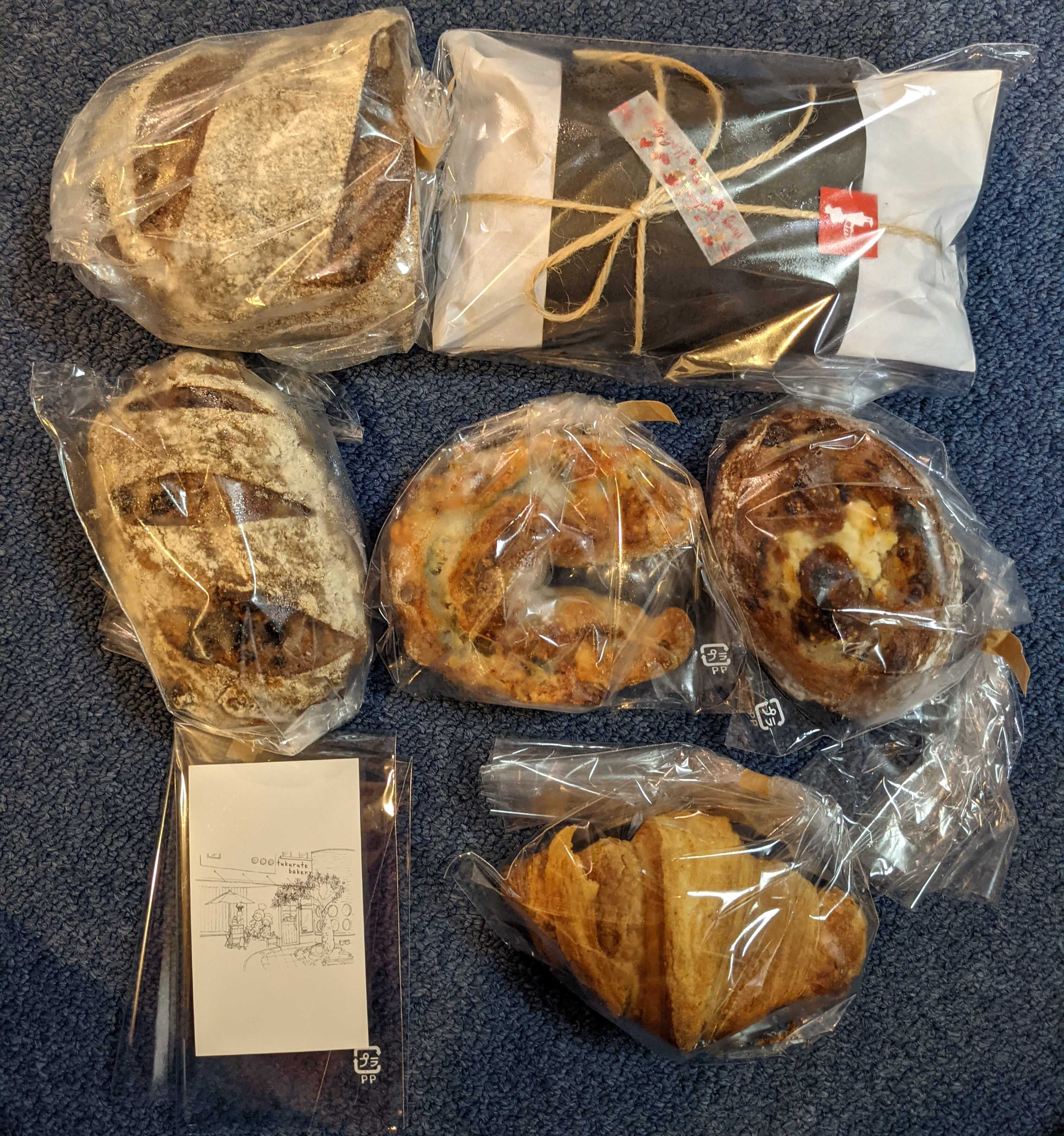 横浜の大好きなパン屋さんブラフベーカリーさんをお取り寄せしてみましたお店の公式HPでたまに発売されるロスパンのセット、SuNSeT まるごとダンボール便。売り切れになっていることもあるのですが、タイミングさえ合えばそんな激戦と言う程でもなく買えると思います。12月25日に注文、27日に発送、本日28日に横浜から千葉に到着しました。SuNSeT まるごとダンボール便(2800円+送料)一週間以内の発送。夕方まで残ったロスパンをちょっとお安く大体30%OFFで送ってくださいます。↑段ボールを開けるのを手伝ってくれている息子の手w↓ちょっと包装(ラップ)が破れてしまっているものがあったけど、配送中に破れちゃったかな?〇ベーコンマンゴー〇アンチョビオリーブパルメザンビ入り〇マッシュルームピザ〇ホワイト食パン〇ホワイトチョコマカダミア〇ポレンタ〇紅はるかのセサミ〇ハーブチーズ〇ピタパン〇グラノーラ&クリームチーズ〇グラノーラ&クリームチーズ ←見た目が全然違うから商品名シールの貼り間違い〇マスタードソーセージエピ〇プンパニッケルチョコベーグル〇チーズのパン(商品名シールなし)の14個入り。うんうん、いいラインナップ上部が空いた段ボールの箱詰めやシールの貼り間違い等ちょっと詰めが甘いけど、問題ない範囲。〇チーズのパン(商品名シールなし)自然解凍→リベイクしていただきました。表面のたっぷりチーズがカリカリと美味しい。そして下の生地は、びっくりするくらいバターがたっぷり。ジュワジュワ。バター好きだから美味しいけど、びっくりするパンでした〇ベーコンマンゴー自然解凍→リベイクしていただきました。カリッとした香ばしい生地の表面が美味しいし、中はベーコン周りが特にしっとりして旨味を吸い取って美味しいスパイシーなベーコンとマンゴーも合うのよね。お店で買って食べた時と同じ美味しさを通販でも味わえました〇アンチョビオリーブパルメザンビ入りパルメザン"ビ"ってなんだろう?打ち間違い?食べてもわからなかった。↓底面。自然解凍→リベイクしていただきました。表面カリッと中はフワの食パンみたいな生地。底にたっぷりのパルメザン、カリカリでチーズのコクがたっぷりで美味しい中にはアンチョビ入りオリーブの実。良い塩っけ。酒飲みが好みそうな感じ。でも私も好き〇マッシュルームピザ自然解凍→リベイクしていただきました。4つに切って3歳息子と2つずつにしたが、1つとられて私は1つしか食べられませんでした。カリフワの生地の上にはたっぷりの舞茸、マッシュルーム?、チーズ。ブラックペッパーが効いてて美味しい〇ホワイト食パン↑6枚入り自然解凍→リベイクしていただきました。癖のないサクッとふわっとした食パン。普通に美味しく、日常使いに良さそうな感じでした〇ホワイトチョコマカダミア自然解凍→リベイクしていただきました。表面バリっと、中はしっとりして丸ごとサイズのマカデミアナッツがごろごろ、中心にはホワイトチョコがとろり。美味しい生地にミルキーなホワイトチョコがしみ込んで美味しビターチョコ合わせても美味しそう。3歳息子と半分個。結構固めだけど一人で食べきりました。〇グラノーラ&クリームチーズ(という名札が付いた別のパン)自然解凍→リベイクしていただきました。これグラノーラ&クリームチーズじゃない…グラノーラ要素もクリームチーズ要素もない。表面にバターと砂糖とカルダモンを塗ってあって、バターと砂糖が溶けて染みて甘くジュワーっと美味しい旨味がひろがります。あと、カルダモンの良い香り~息子と半分個にしましたが、すごく気に入ったみたいで「これ〇ちゃんすきー」って言って食べていました。カレーとかで食べてたかもしれないけど、初カルダモンになっちゃった。3歳児ってこういうスパイスもイケるんだ…。〇グラノーラ&クリームチーズ自然解凍→半割りしてリベイクしていただきました。これが本物の方のグラノーラ&クリームチーズ噛むとクランベリーの甘味や雑穀類の複雑な味がいっぱいして美味しいクリームチーズもけちらずに一杯。これ好きです美味しかったです。〇ポレンタ自然解凍→スライスしてリベイクしていただきました。封を開けるとすごいローズマリーの香り。食べてもローズマリーがすごい主張大好きだから美味しい~これ好き表面バリっと香ばしくって、中はしっとり、かぼちゃの種が中にも表面にも一杯、表面にはコーングリッツもまぶしてあるみたい。見た目よりも顎を使って、かなりお腹にも溜まる満足度が高いパン。小麦の風味がしっかりした中でローズマリーいっぱいで美味しいパンでした。〇紅はるかのセサミ自然解凍→リベイクしていただきました。たっぷりのごまがかかった表面はバリっと香ばしくって、中はしっとり真ん中に甘い紅はるかこれもしっかり顎を使って噛む感じ。噛むほどに美味しくて好き。3歳息子と半分個にしたけど、気に入ったみたいで一生懸命食べてました。顎が