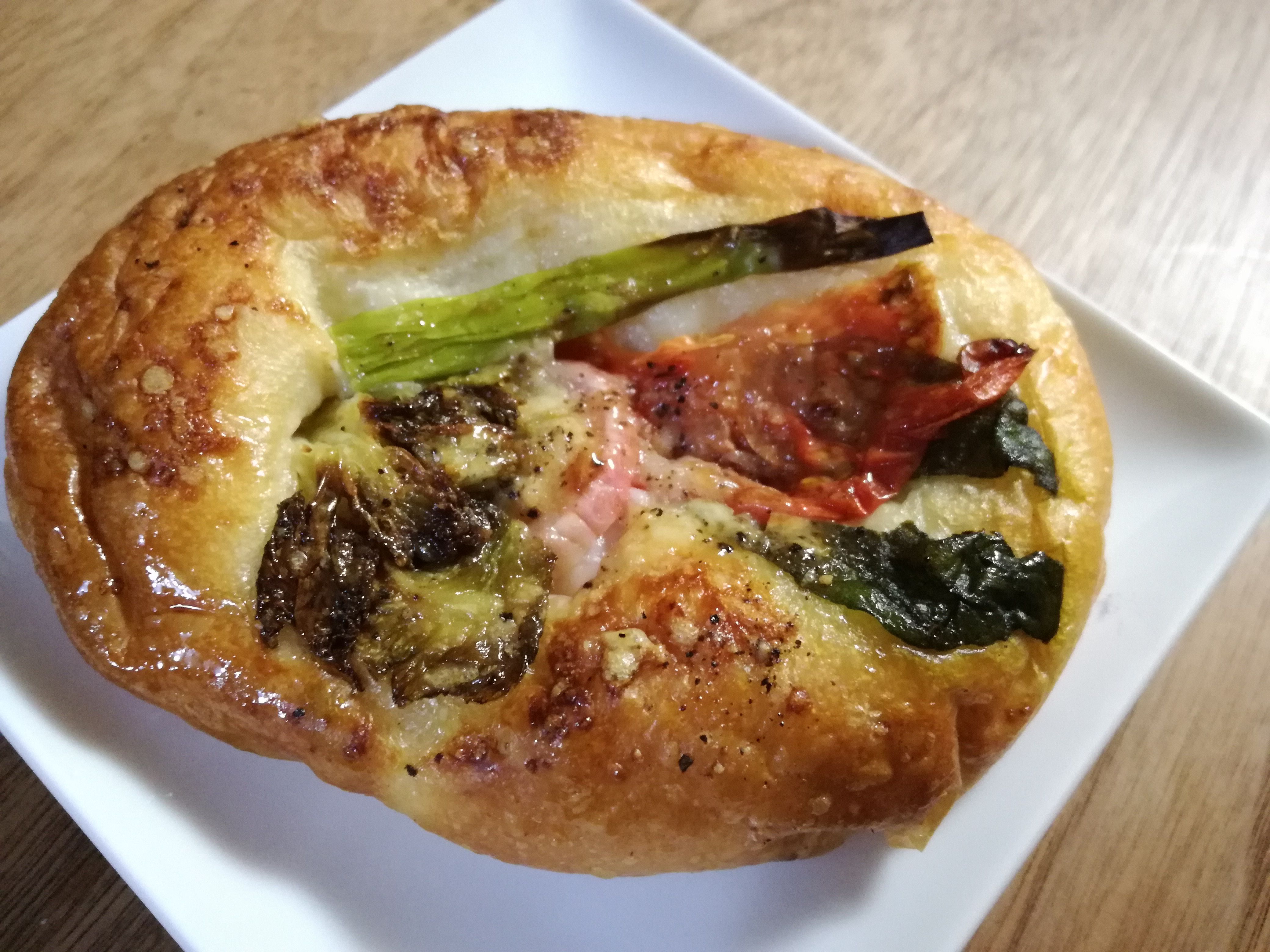 新百合ヶ丘周辺の農家のお野菜を使っているということで、アスパラやほうれん草、トマト、菜の花かな~…がベーコンとともにしっかり目のブラックペッパー。