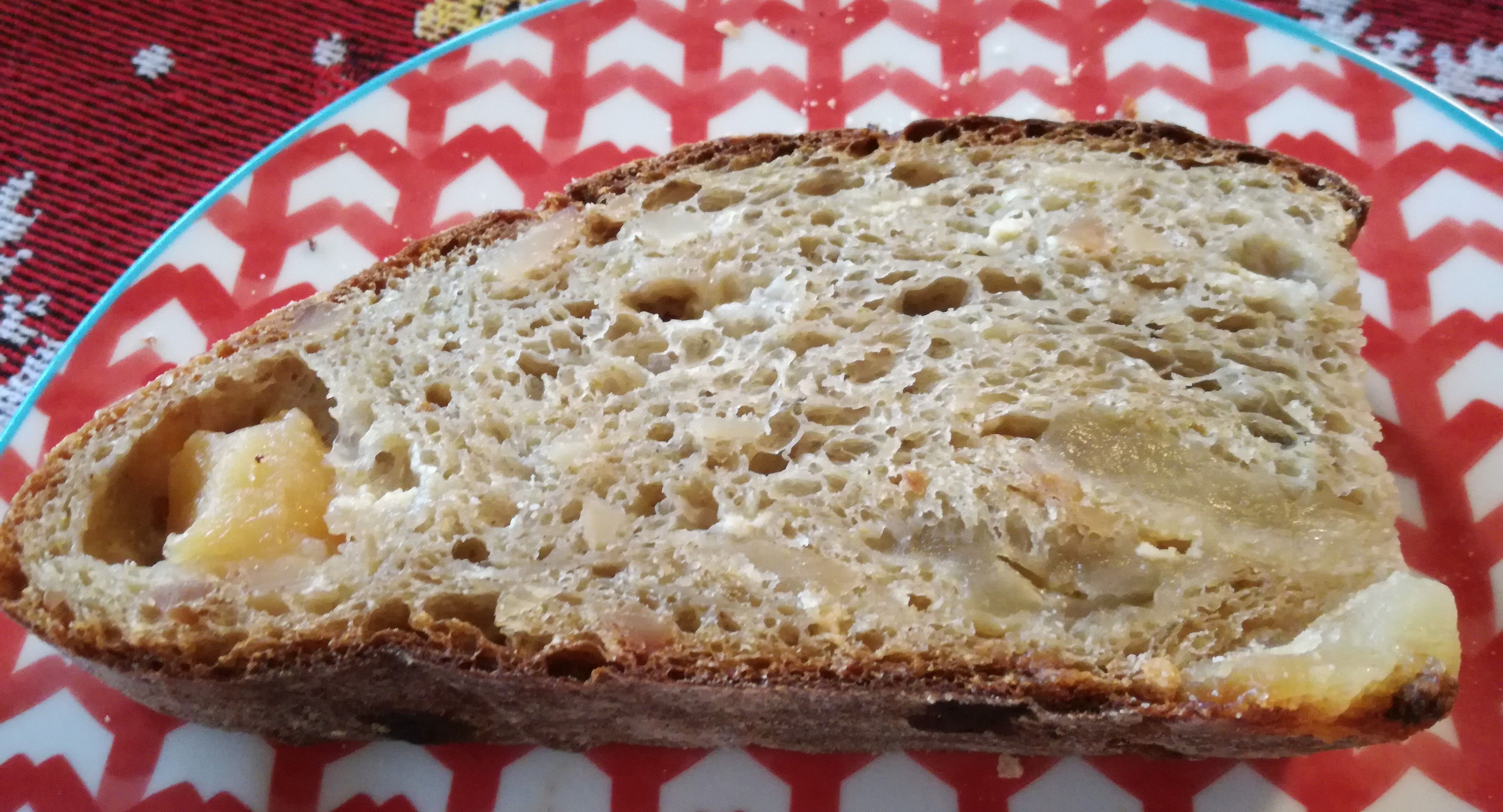 カモミールが練りこまれたもっちょもちょの高加水の美味しい生地に、りんご・パイン・アーモンド・白チョコが入っています。