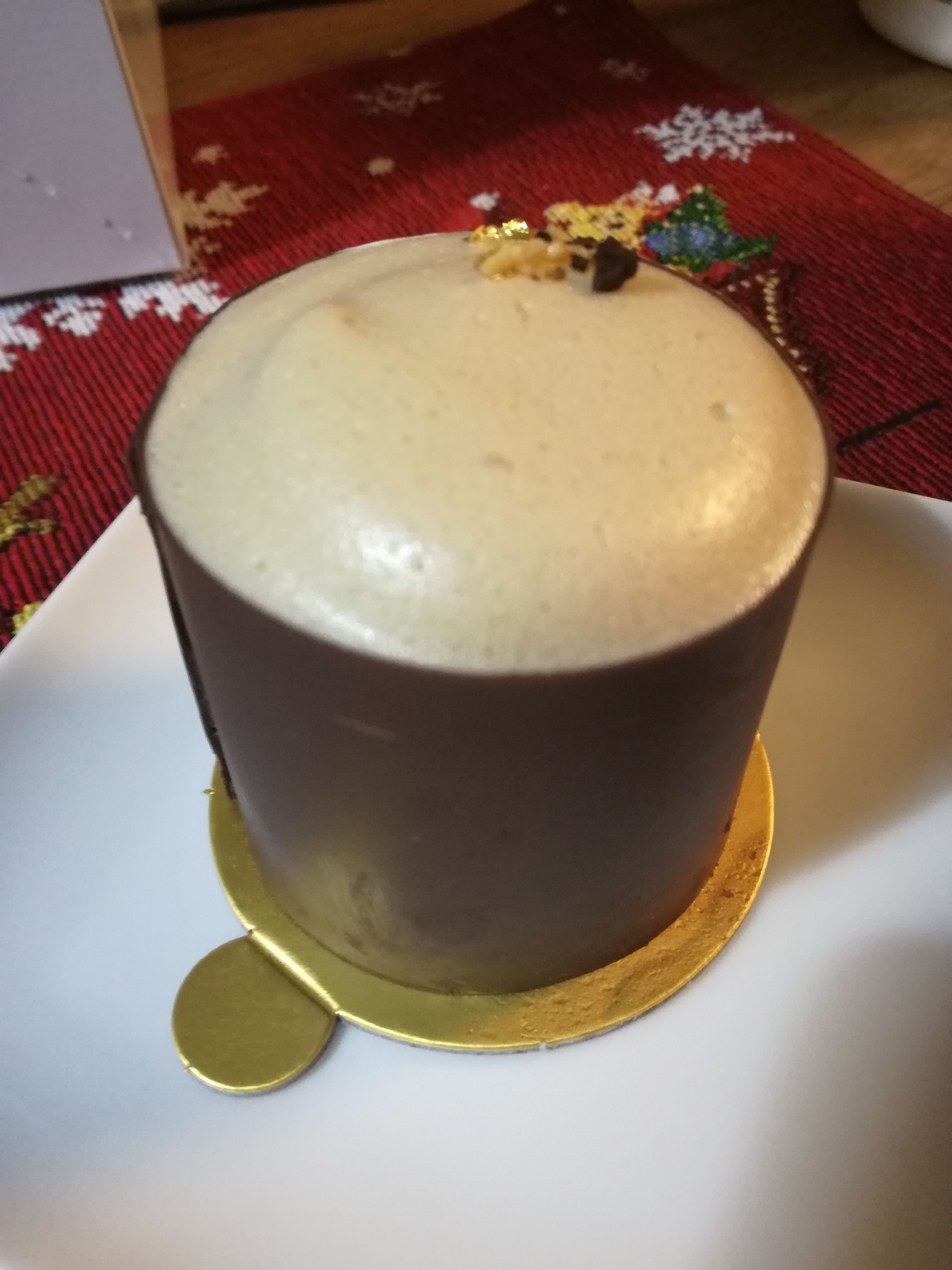 洋酒がしみ込んだココア生地の上にムースショコラカフェ、その中心にはカフェのジュレとバニラのブリュレ、そしてトップにはカフェの泡を飾って、周囲を薄いチョコで飾っています。