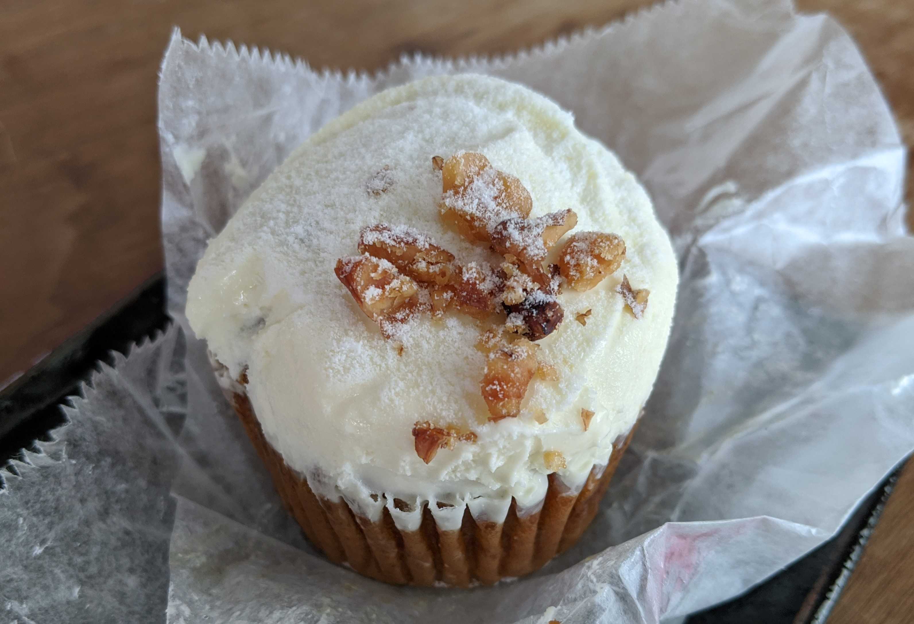 たっぷりの有機人参の細切りとスパイス、くるみを入れたしっとりしたカップケーキ、上はクリームチーズのクリームということ。