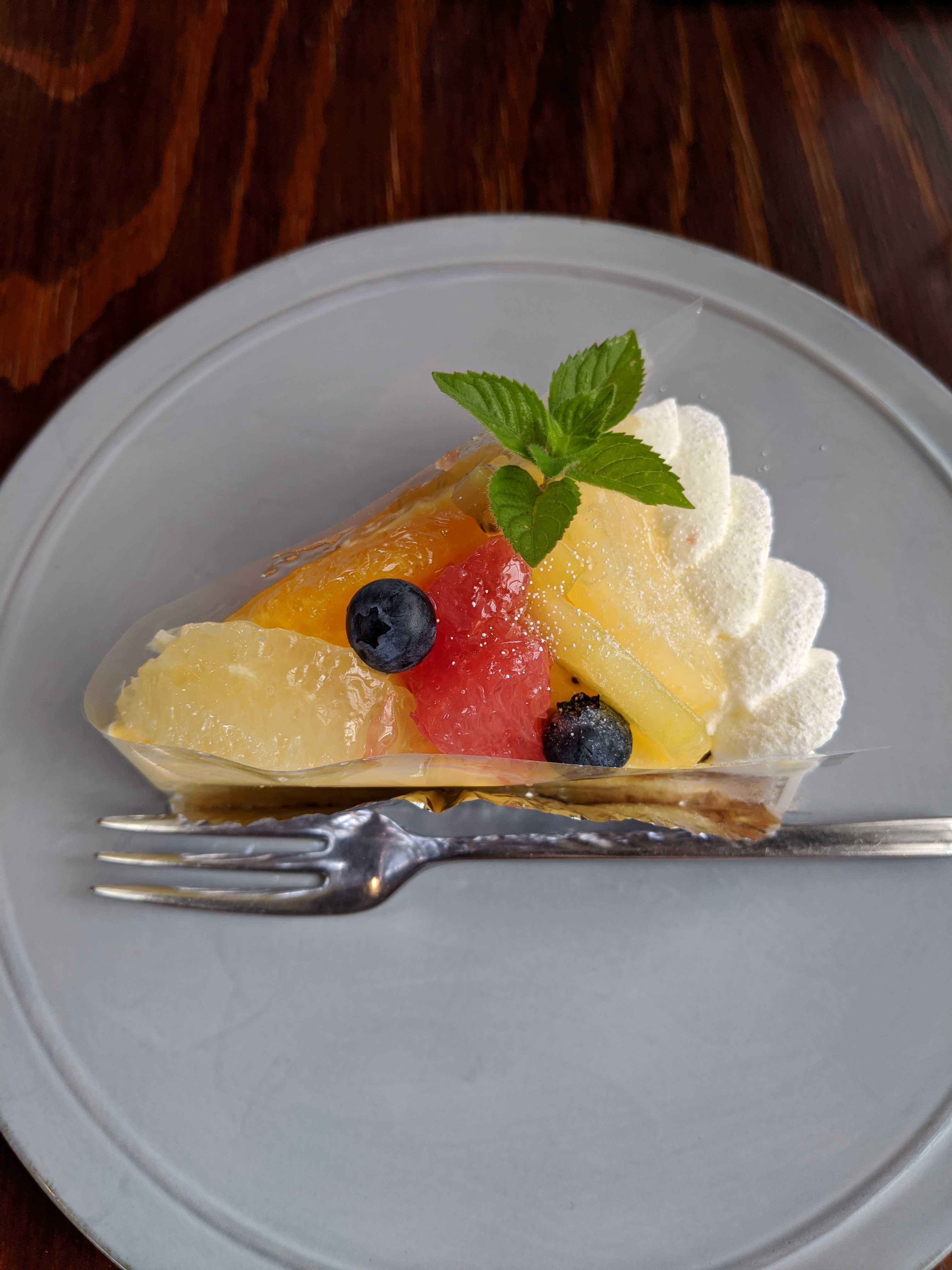 さっくりしたバターの風味が良いタルトにアーモンドの風味がいいダマンドクリーム、そして滑らかなカスタードクリーム、フレッシュなフルーツたちが美味しい。