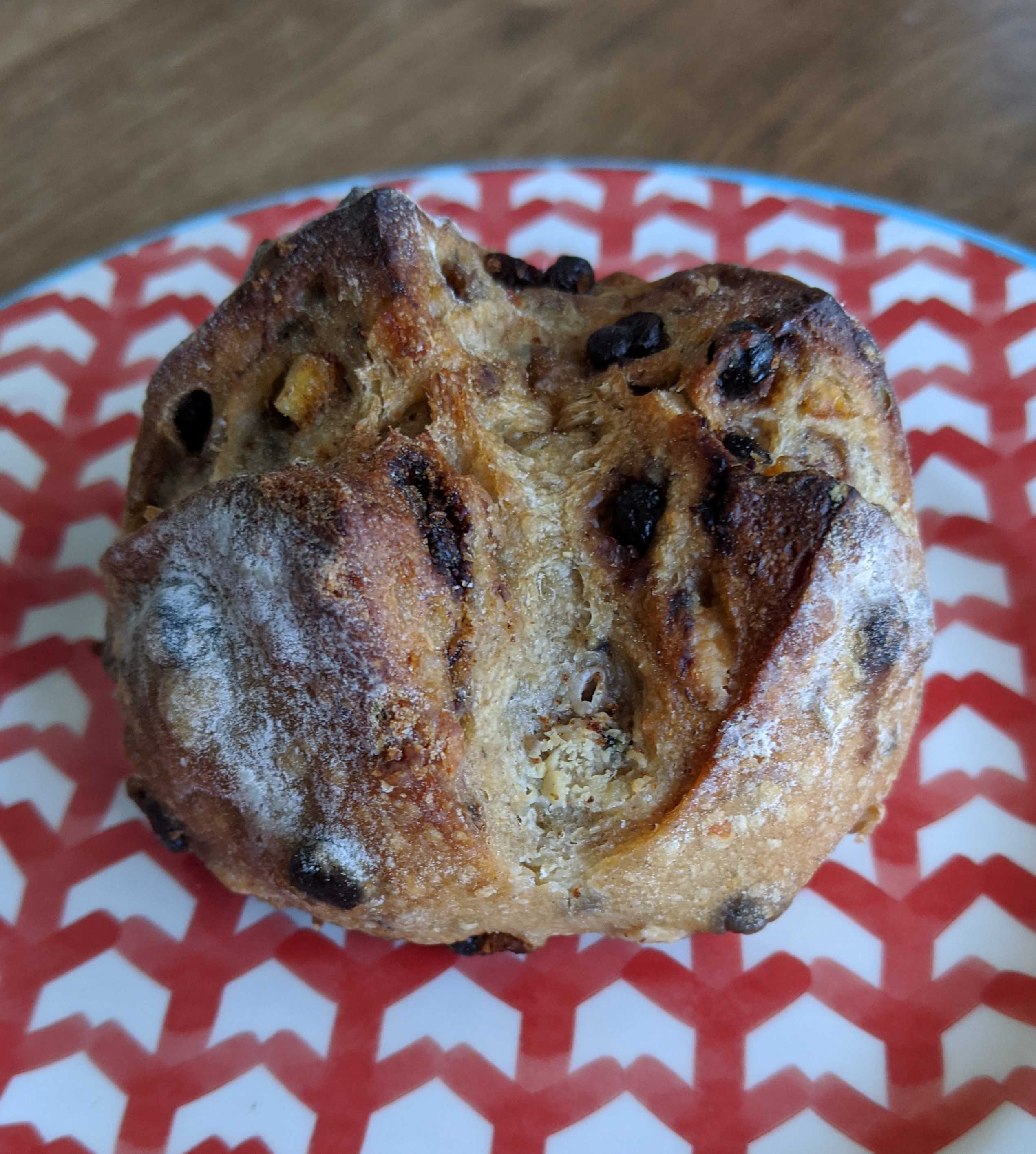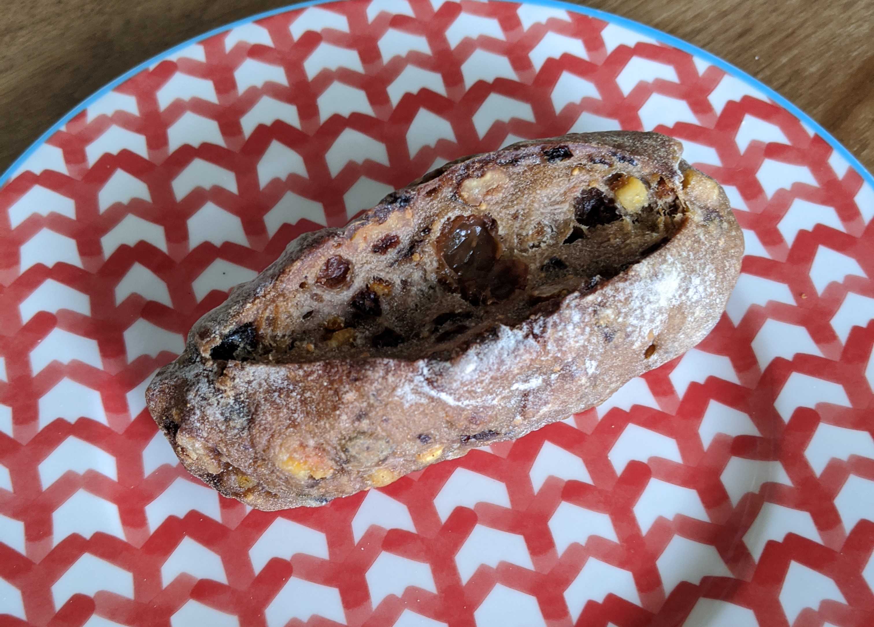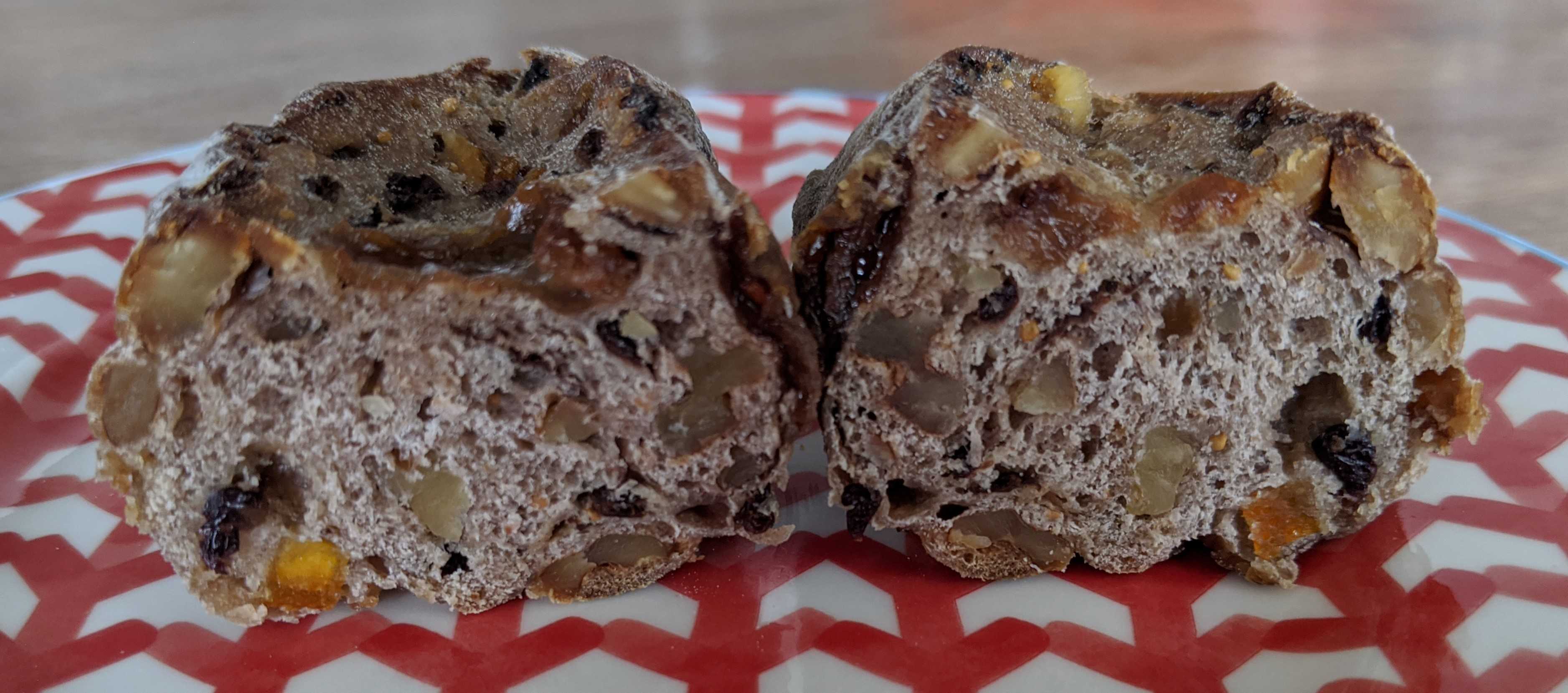 2種類のレーズン、カレンツ、イチジク、オレンジ、そこにクルミを加えて生地に練りこんでいます。チーズ全般、ワイン全般、広範囲でカバーしてくれる優れものです。