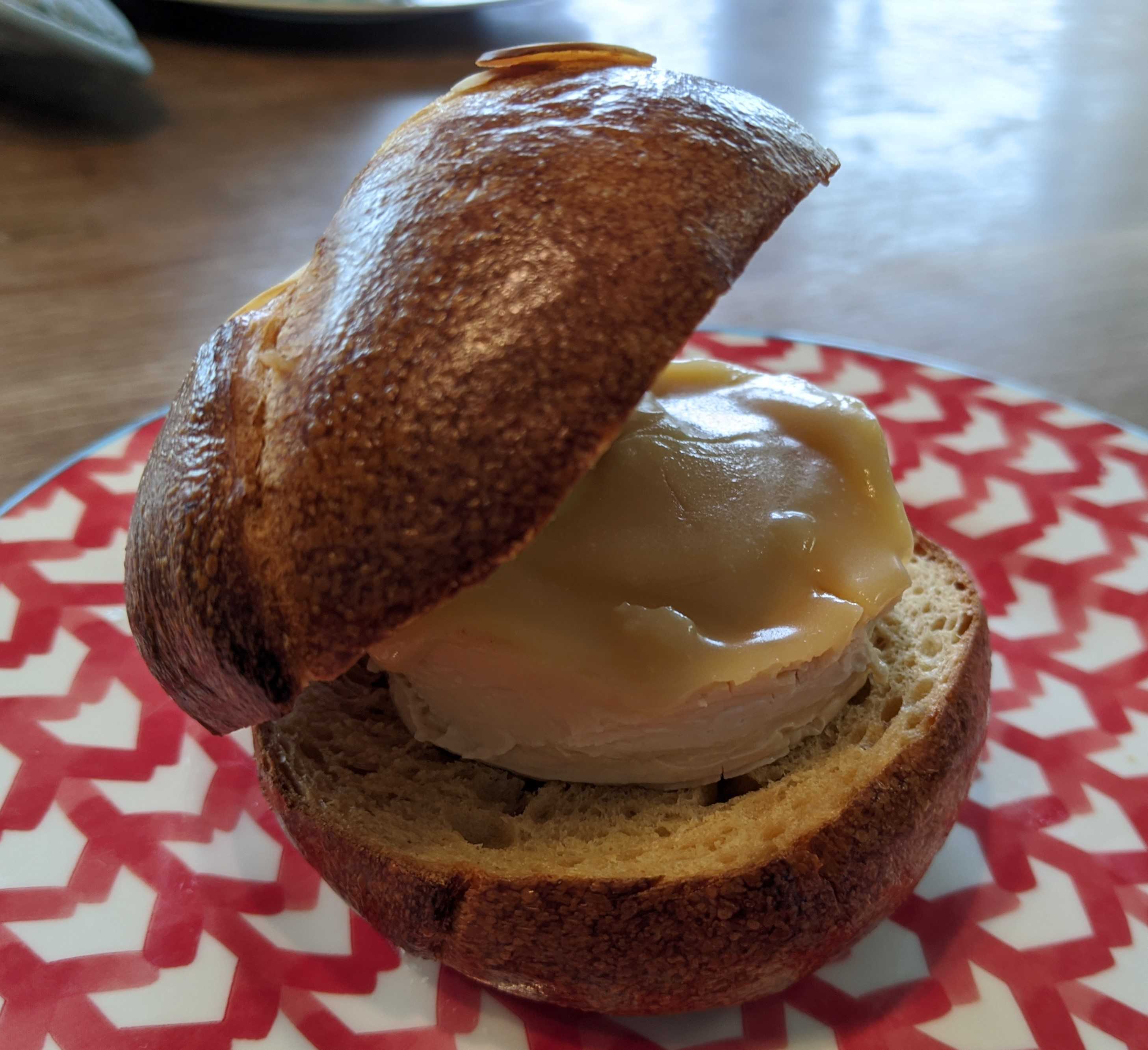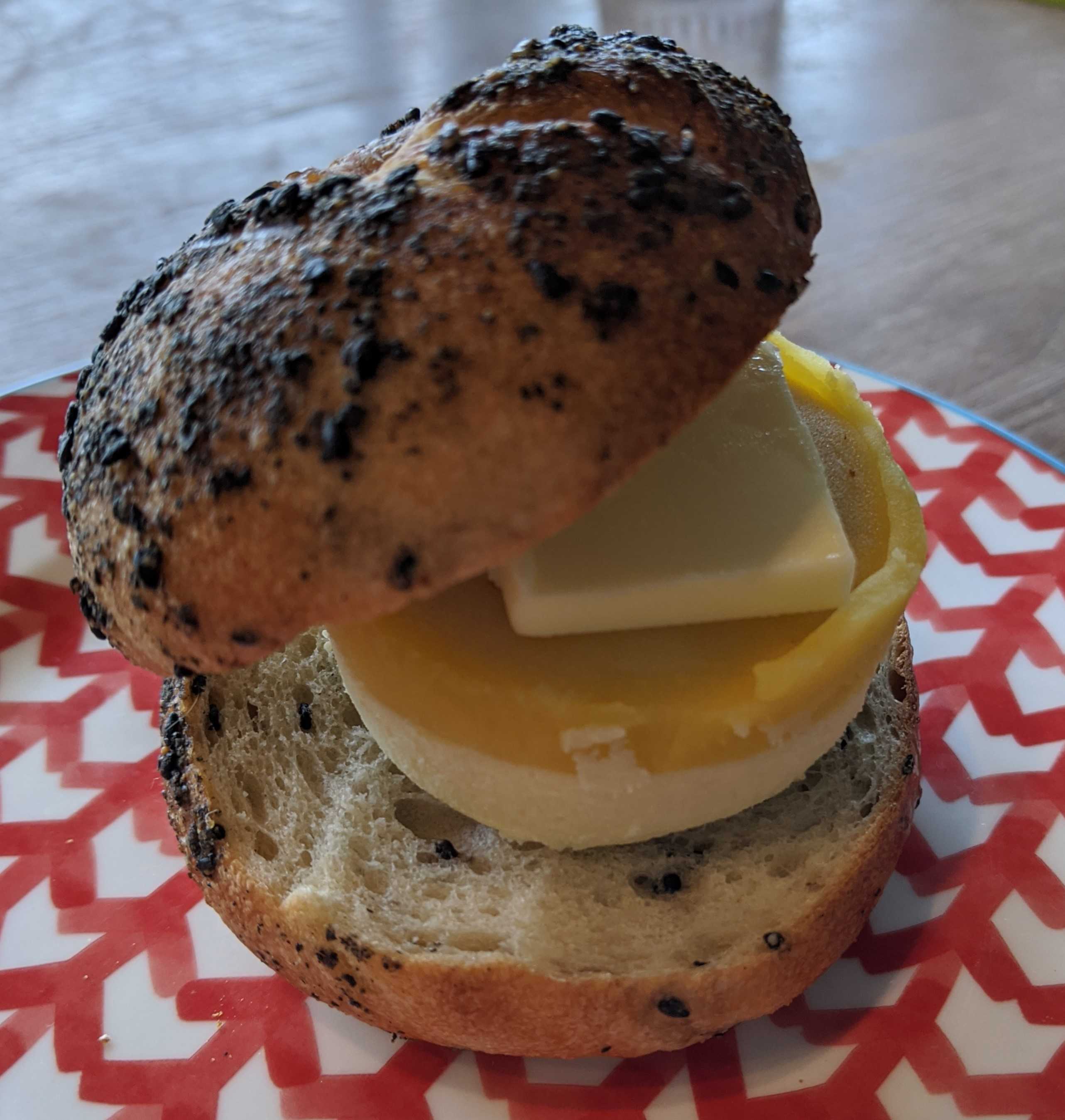 ベーグル:自然解凍→霧吹きトーストで、冷凍のままのフィリングを挟んでいただきました