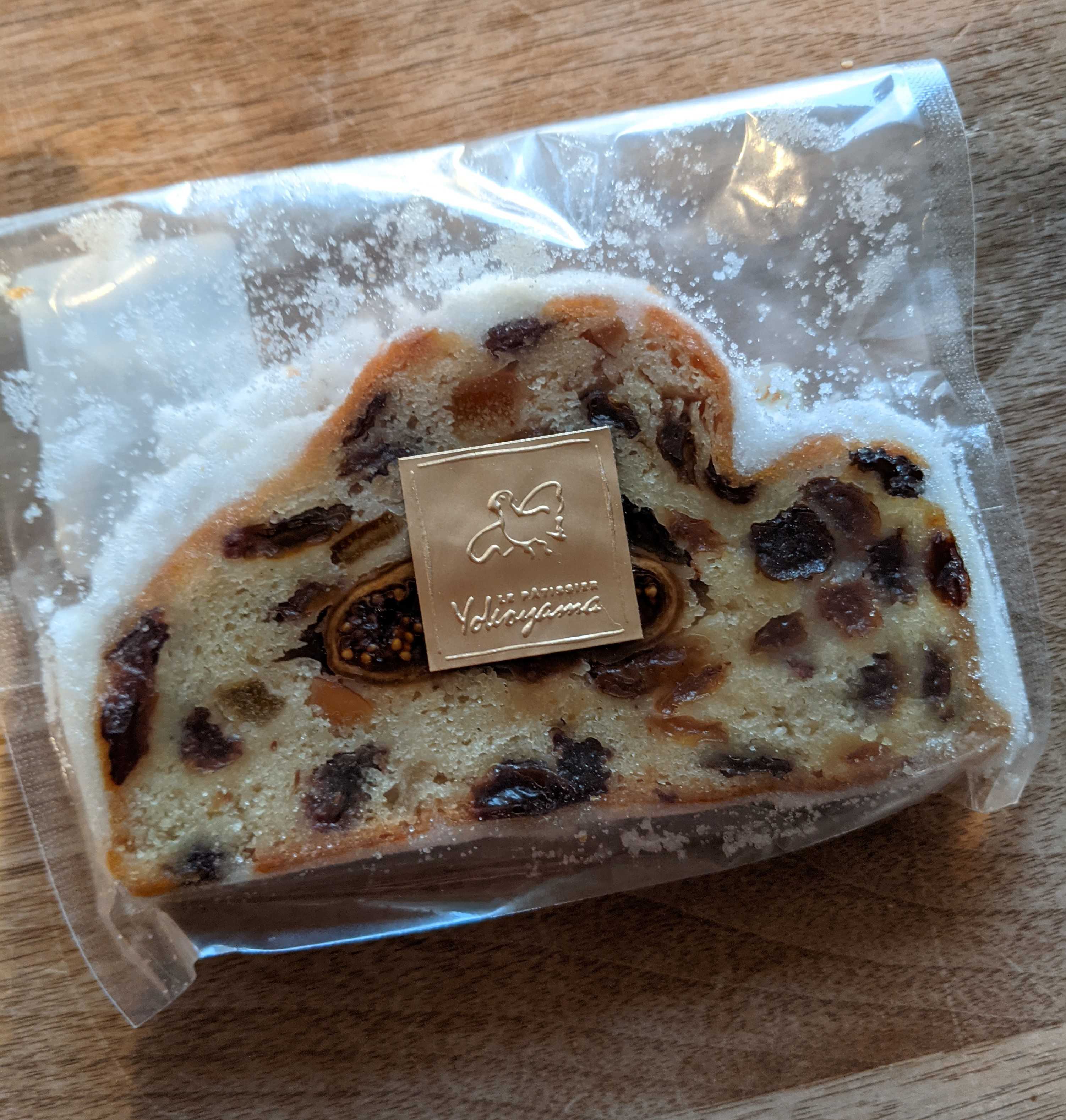 全体にラム酒が効いたしっとり生地に、たっぷりのレーズンと、オレンジ、いちじく、アーモンド。