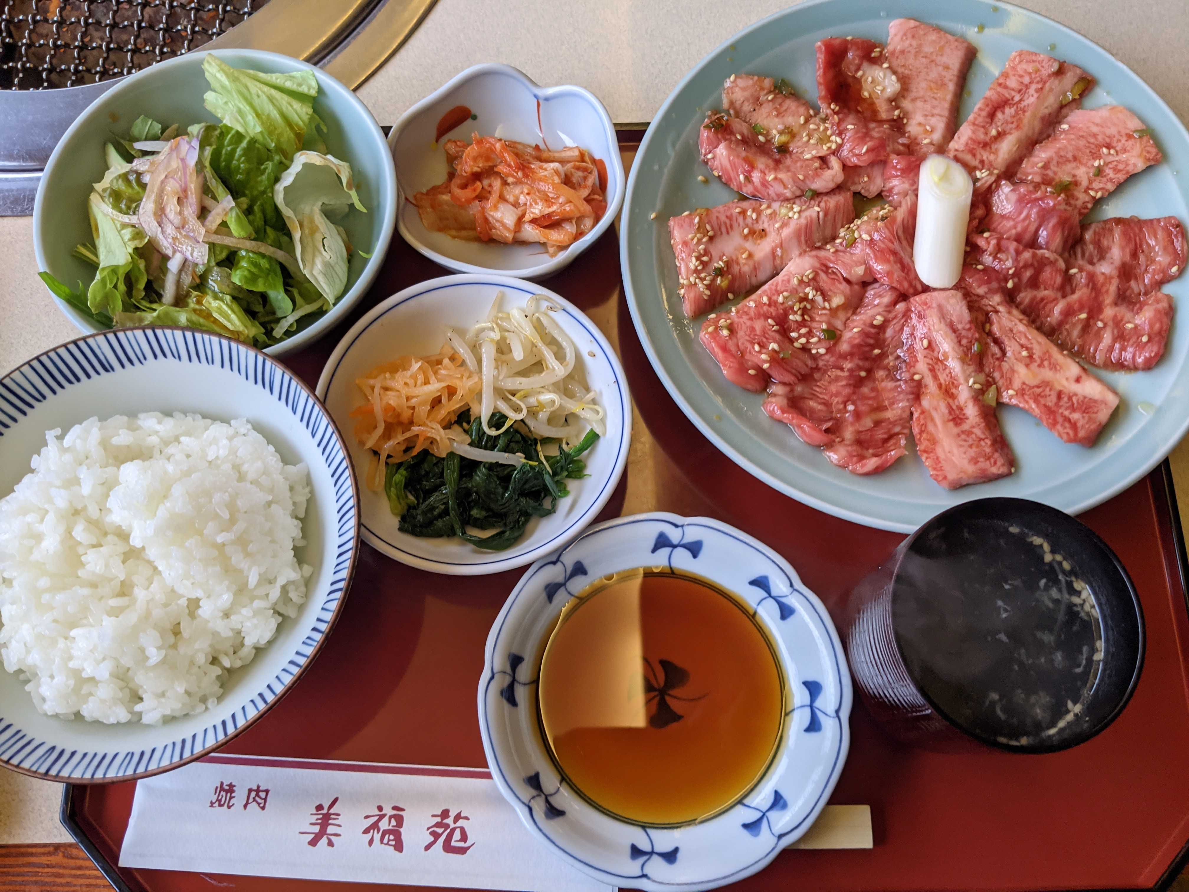 ワカメスープ、キムチ、ナムル、サラダ付き。
