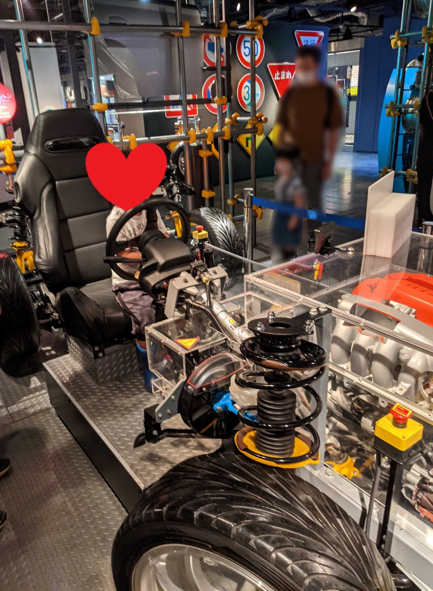 スケルトンの車の中身を見ながら、車の運転体験ができるところ。