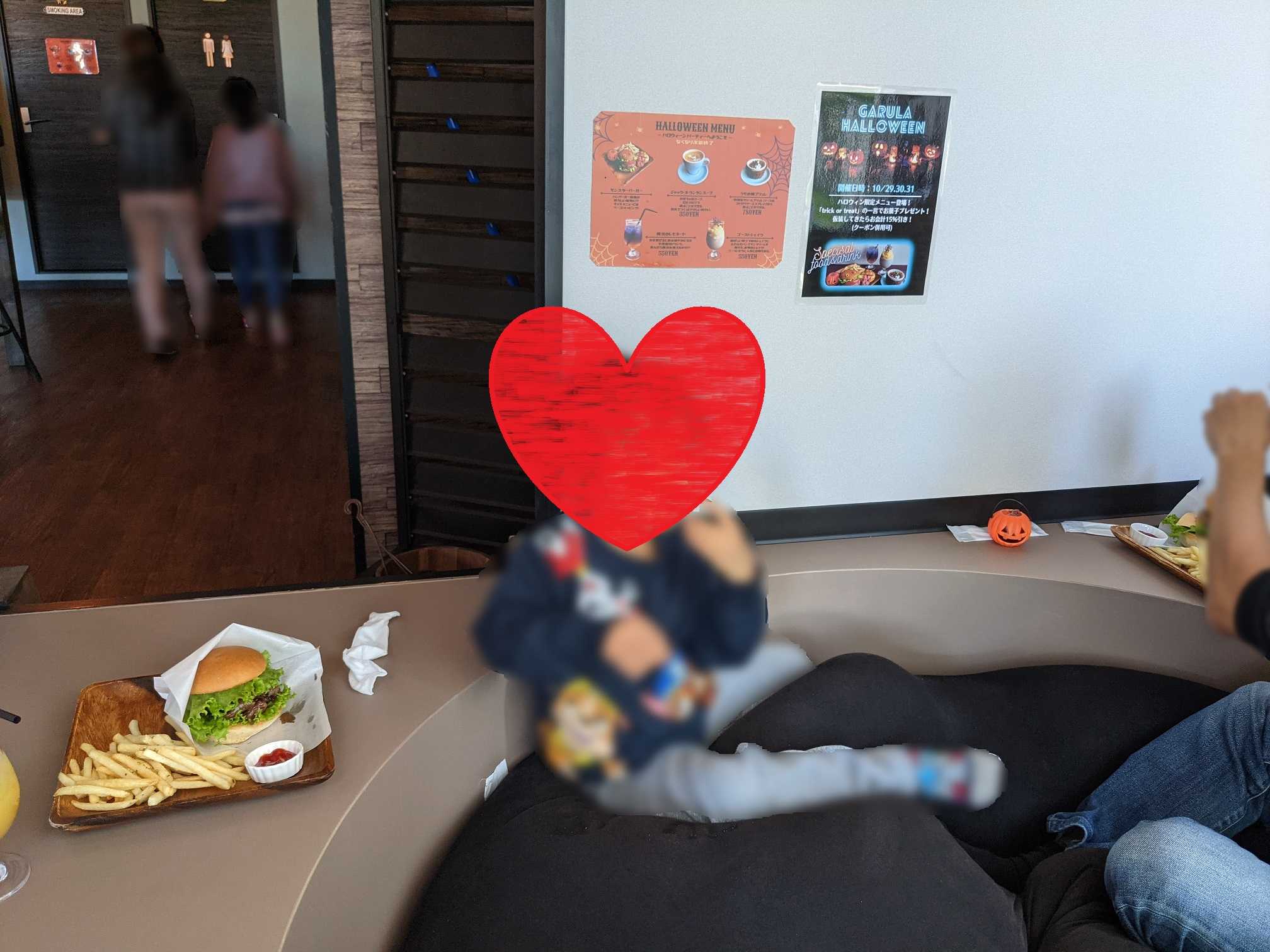 食べ終わるといつもはすぐに帰りたがる3歳児も、ヨギボーが気に入りすぎてゴロゴロ。