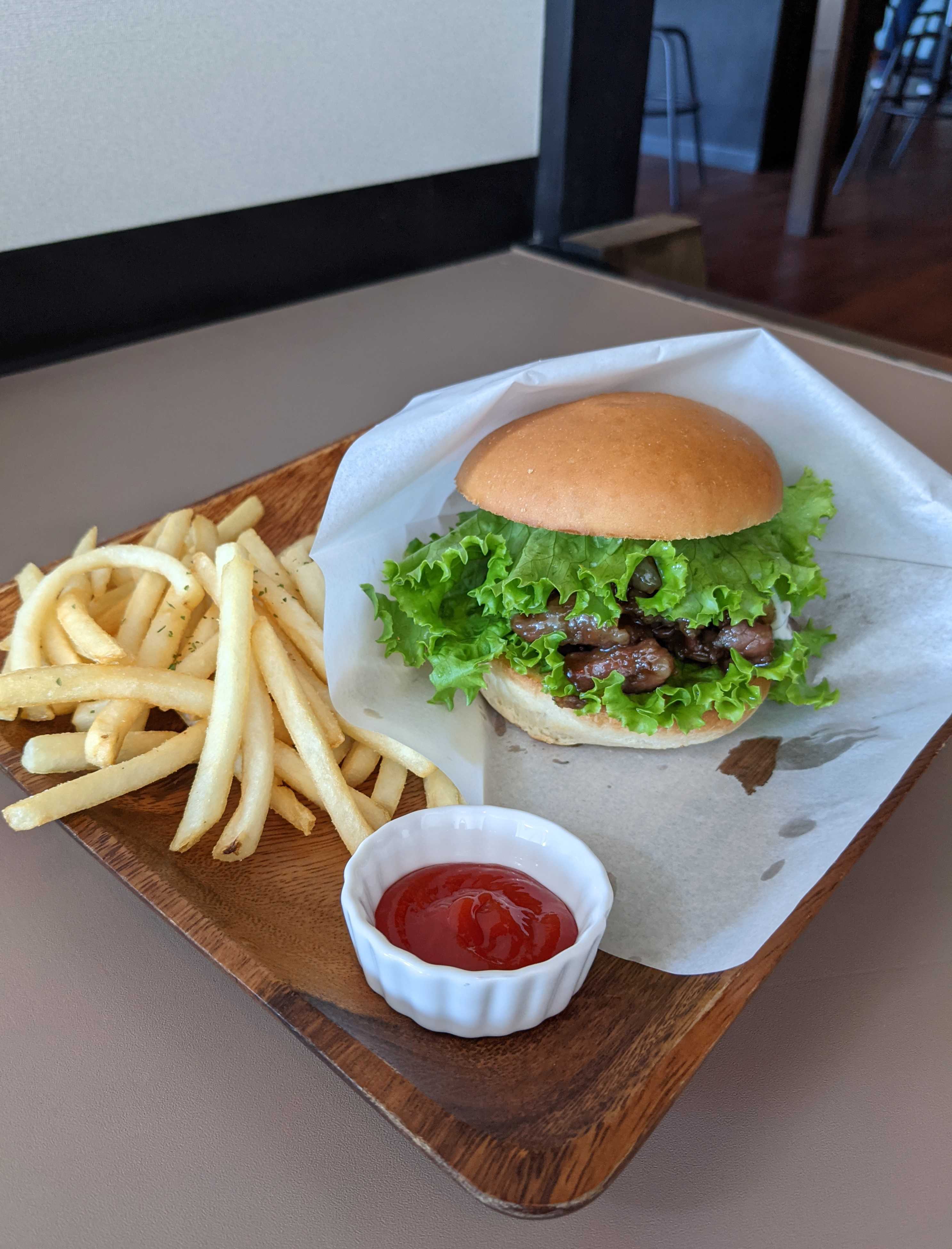 慣れればくつろいで食べられるし、甘辛味の薄切り牛肉の焼肉が挟まったハンバーガーもなかなか。