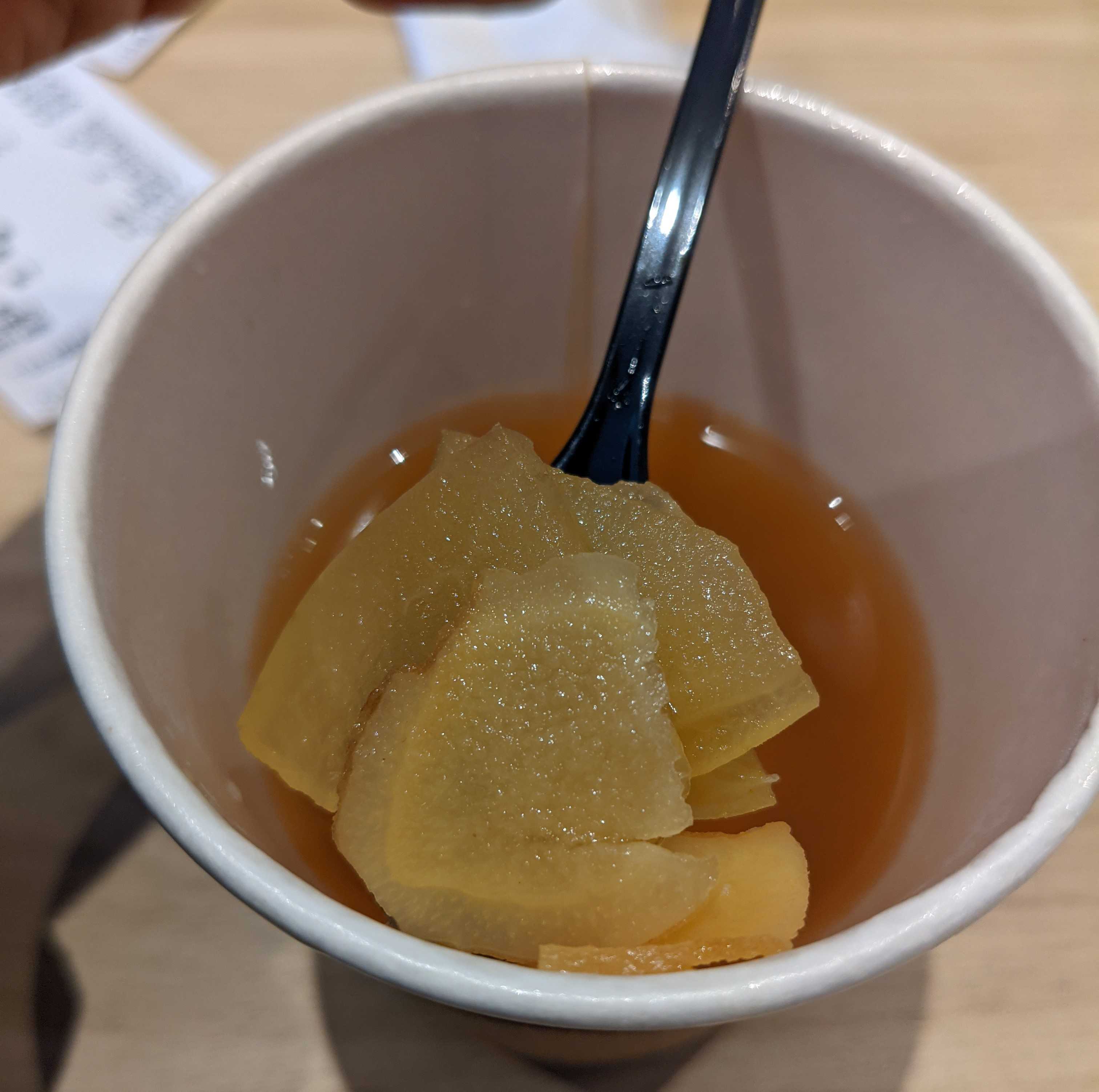 アップルジンジャーティーは一杯リンゴと生姜の薄切りが入っていました
