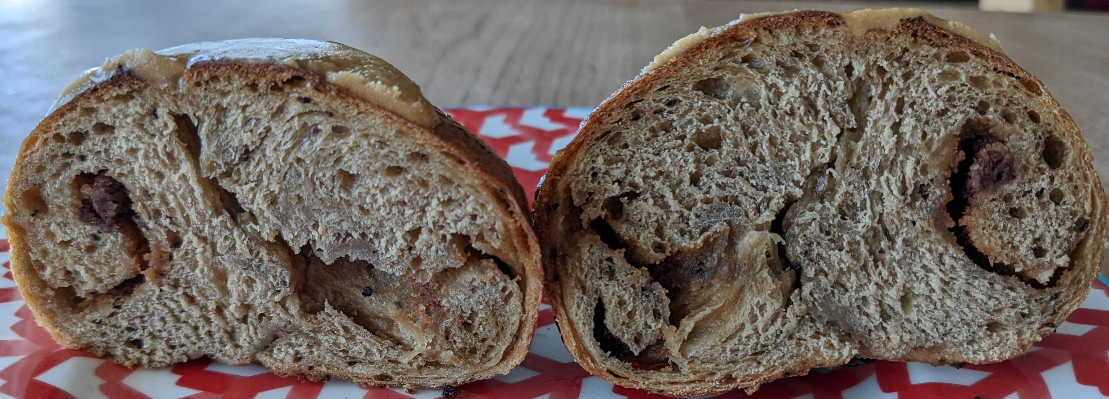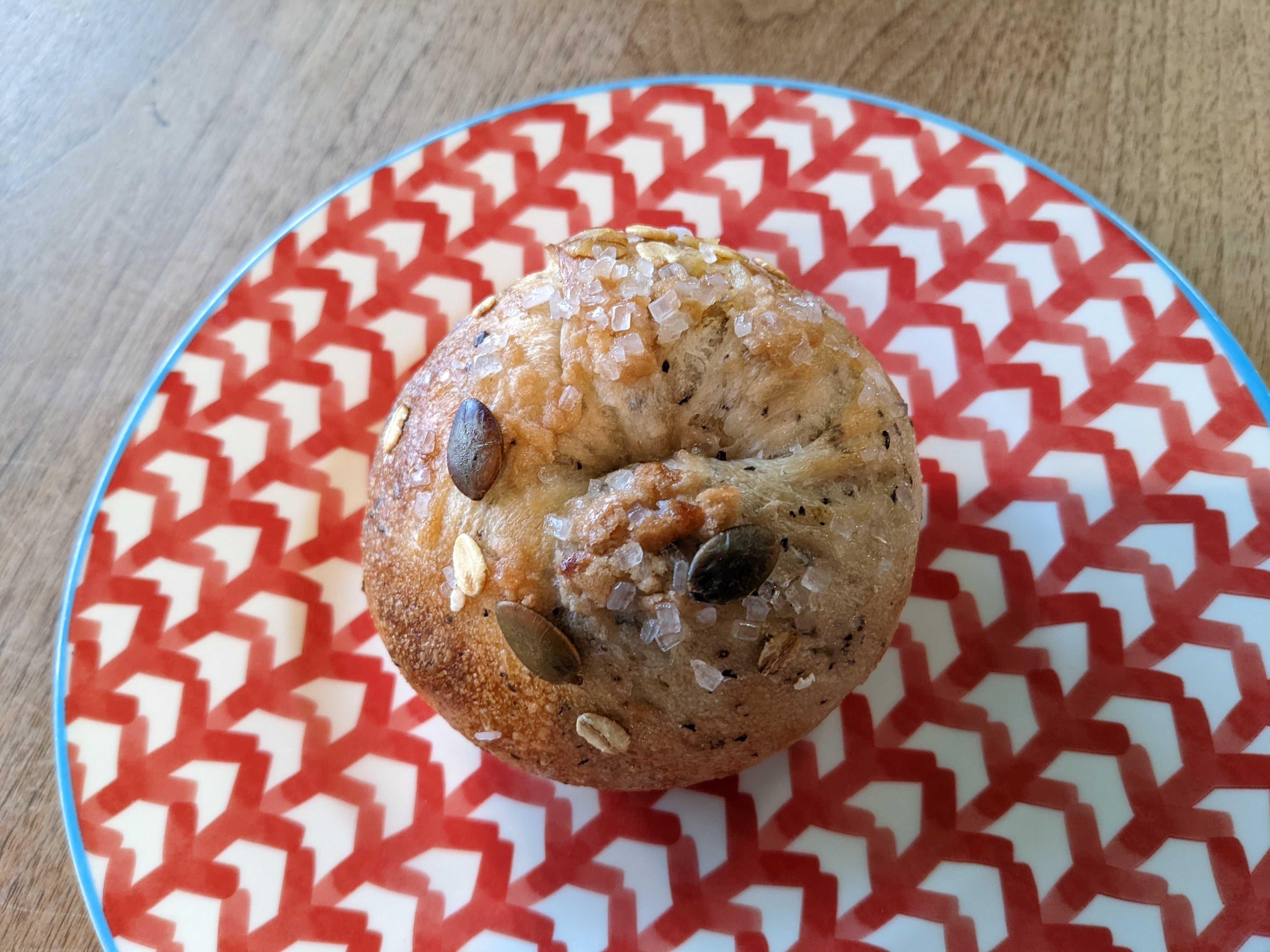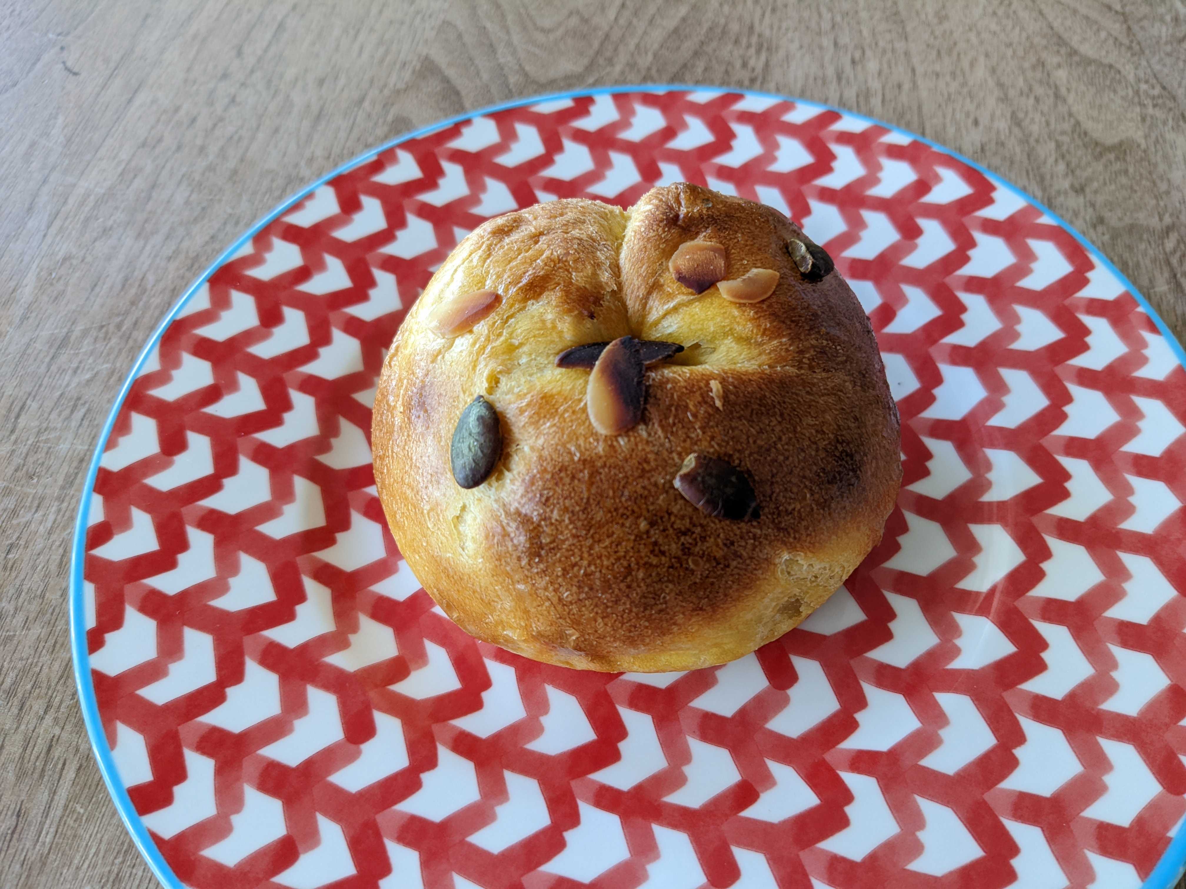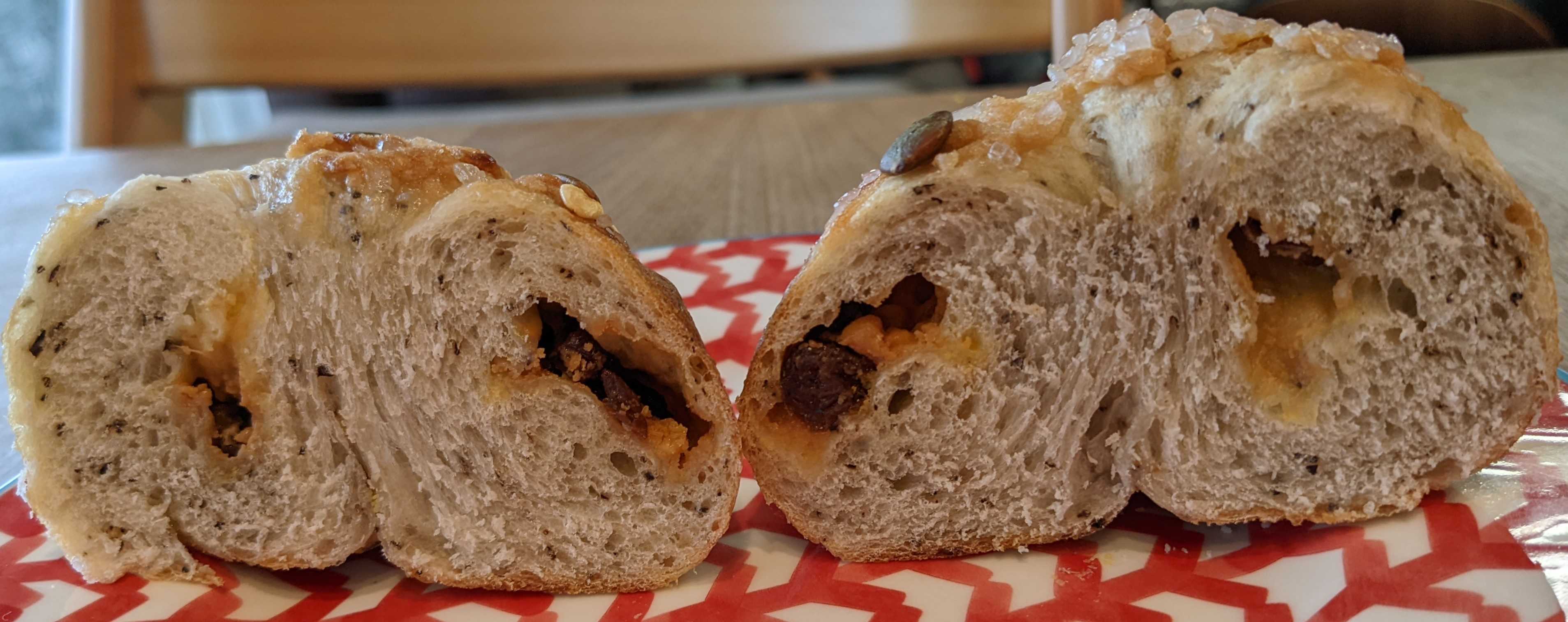 しっかり香る紅茶生地はバリっとムギュっとして相変わらず美味しくって、表面のザラメもガリッと噛むと甘くて美味しいし、かぼちゃの種やオーツ麦もリベイクで香ばしくなって美味しい