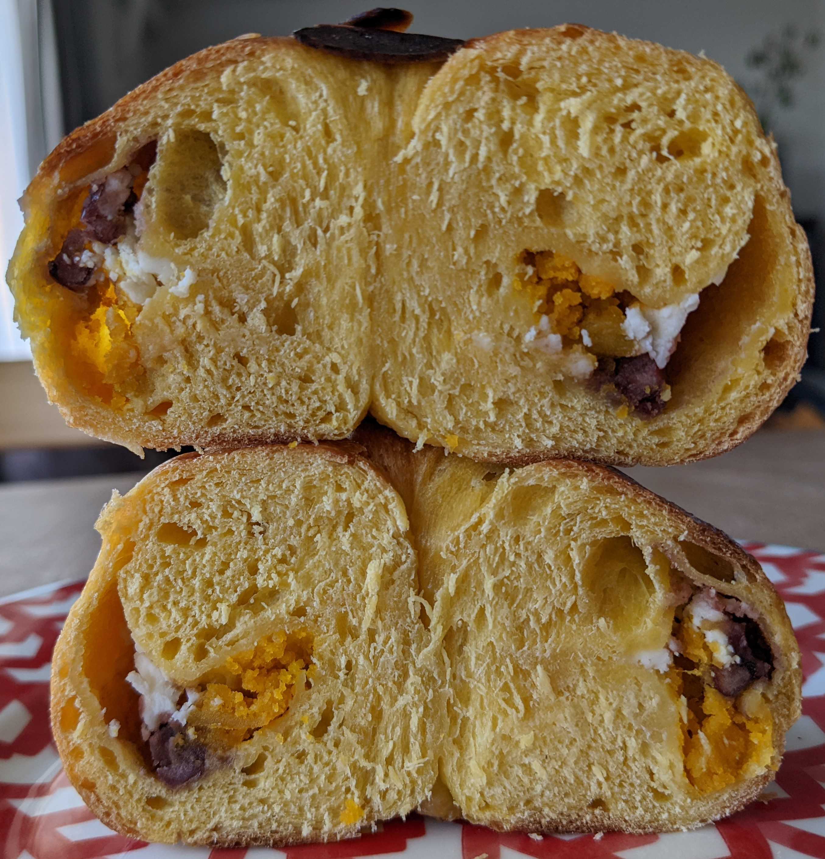 中には南瓜ペーストと粒あんとクリームチーズ入り。