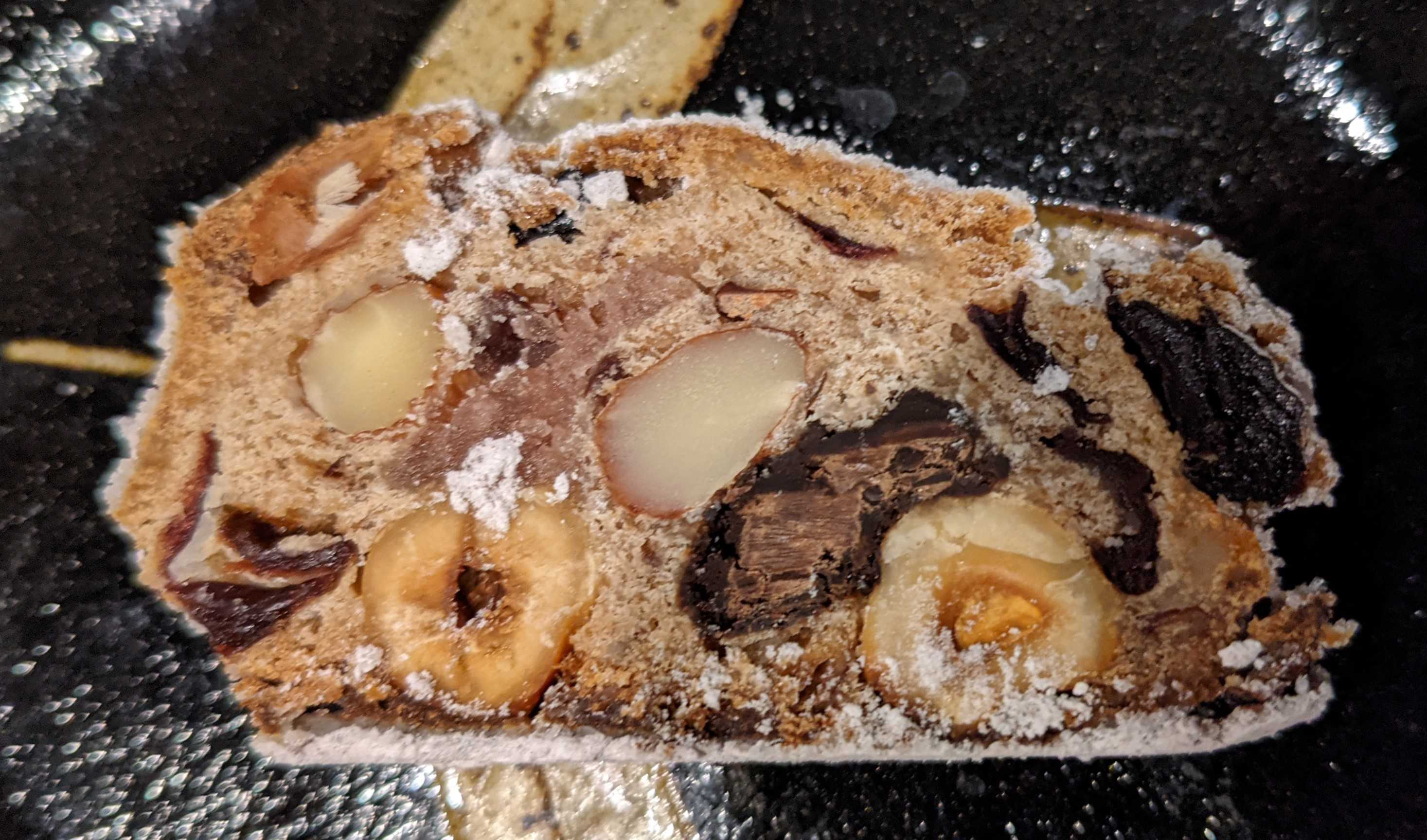 冷蔵庫で年始まで保存して食べましたが、段々と表面の粉糖がしみ込み、洋酒やスパイスが混じりあって馴染んでしっとりとしていって、それもまた美味しかったです