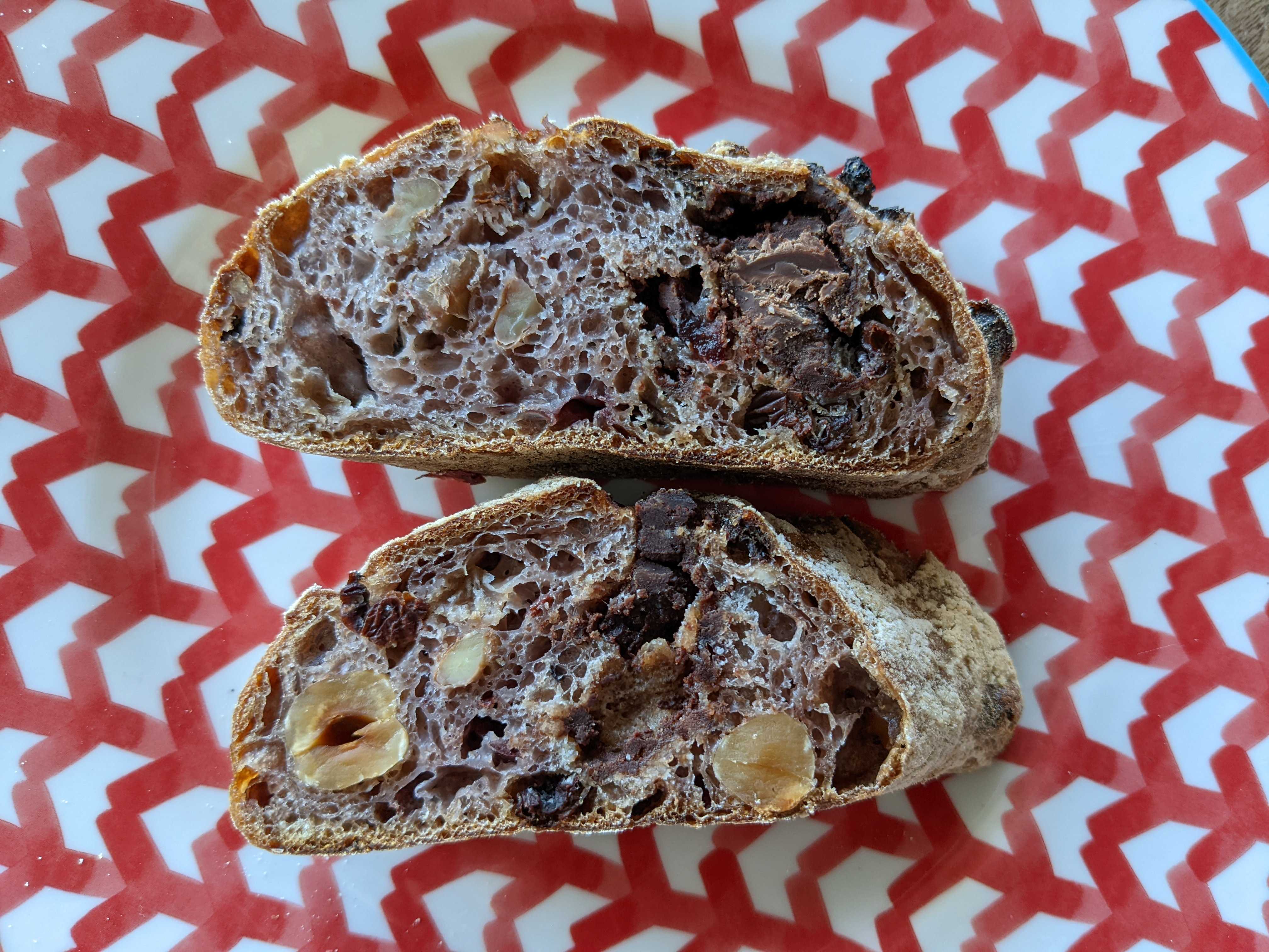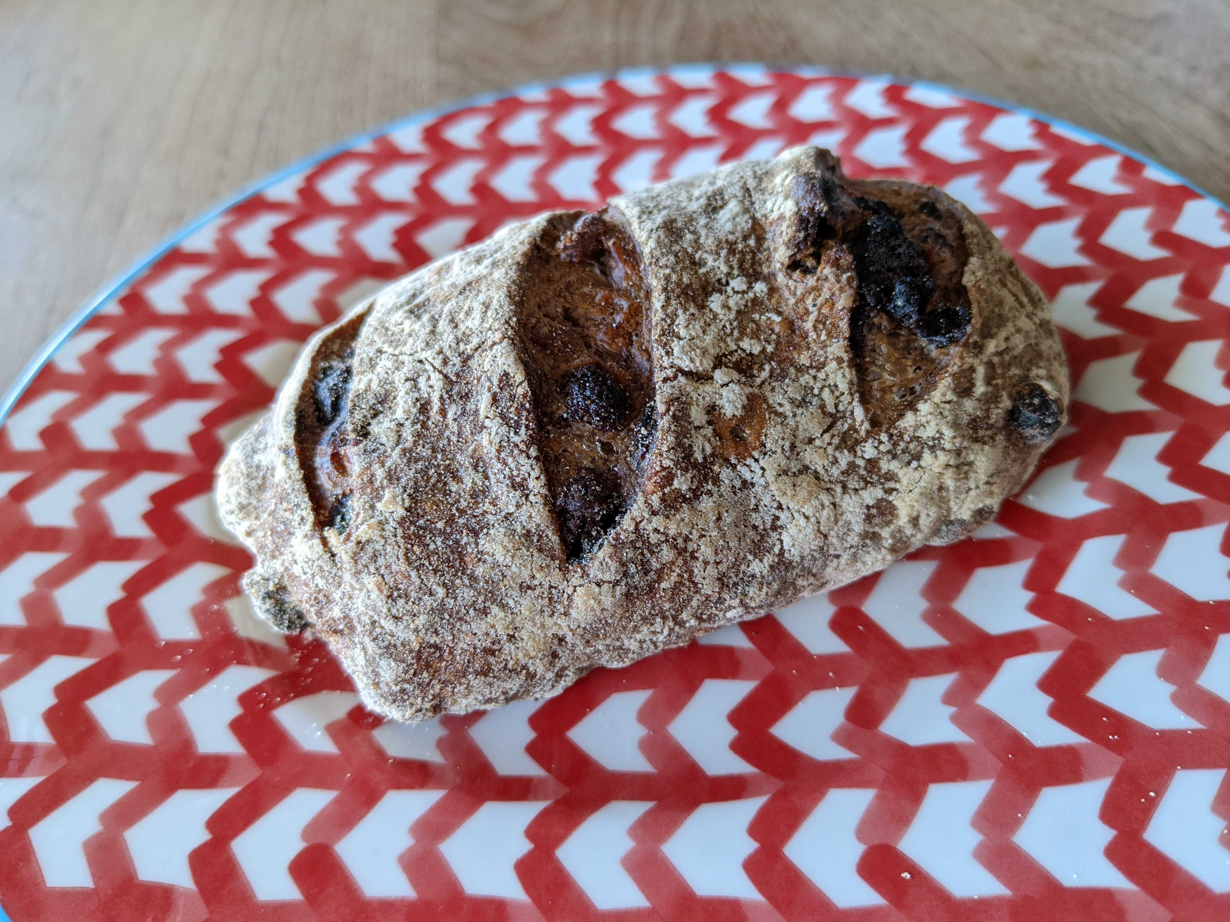 粉の風味が強くて美味しいパンにチョコの甘みとフランボワーズの酸味、コリコリナッツの香ばしさがいい