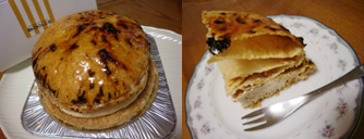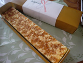 頂いた、美味しいモノ。守山市のドゥブルベボレロのケーキ、「アイアシェッケ」。そぼろ状クッキーの下には、バターとカスタードクリームの層、クリームチーズ主体の層(レーズン入り)、そして一番下はクッキー生地の4層仕立て。・・・なんだとか。上段のカリカリ・サクサクした部分と下のクッキー生地があるので、濃厚だけど、サラリと食べられて、もっと!もっと!とフォークを進めてしまう~。クリームチーズとクッキーとレーズン、ちょっと「マルセイバターサンド」を思い出す感じ・・。いや~、美味しいね、コレ。9月になると、秋のケーキが並ぶね~。栗のスイーツと言えば、ドゥブルベボレロのマロンパイが、ものすご~く美味しかったね~と、先日、マロンパイを思い出しながら美味しい想像をして、夫婦でニヤニヤしていた。その光景を、もしやもしや覗かれていたのか!・・と思うくらい、絶妙なタイミングで、今回のプレゼントが届いた!senchanさま、いつもありがとうね~。美味しくいただきました。ぜひぜひお店にも行ってみたいわ~。