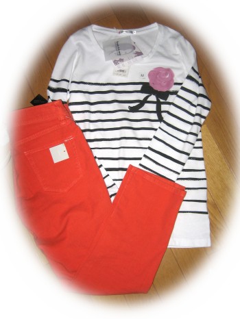 先程の日記に引き続き本日2回目の更新さっきはチーク&ファンデのレポしたのですが今回はユニクロで買った物のお披露目を何か、今日の朝ユニクロに行ってる夢を見て、夢の中でもしっかりと買い物してたwで、今日はそれを買いに行ってきました( ´゚ω゚`):;*.':;ブッ夢の中の商品をそのまんま買って来ました私が夢に見た商品はオレンジ色のカプリパンツ似合うか似合わないかそんなの関係無しでこれは買おうと決めてた( ´゚ω゚`):;*.':;ブッで、手書き風のボーダーTこのボーダーT・HMさんの所で見て気になってて、実際見たらたまらん可愛くて買っちゃいましたで、彼氏が買ったのもついでにUP彼氏は、ボーダー族なんでボーダーの物沢山持ってます何か可愛い系狙ってるのかインナーはピンクを選んでました( ´゚ω゚`):;*.':;ブッで、早速ユニクロで買った物早速着てみた~うん。可愛い!!藤原紀香には到底敵わない足の長さですが。。。><スキニーカプリってやつみたいだけど色の発色もすごく良くてすごく気に入ったよこれにサスペンダーとシンプルTとかと合わせて着たいんだ~お次はボーダーTさっきのカプリパンツの上に着ただけ~胸の花がかわゆいね~後ろはこんなん。。。ハイヒール柄になってますとっても可愛くて二つとも本当に気に入った~ガンガン着たいと思いますそれと共同購入でオルタネイティブのTシャツ買いました~共同購入のアフィ出せないんだけどなんでそれと、ホワイトデーでこのウィッグもポチ~これで少しでも私の髪の毛がマシになりますよーに