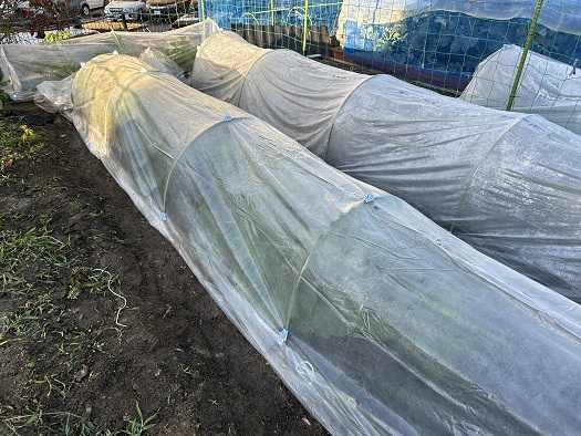 ビニールトンネルをして完了です。トンネル内の温度が上り過ぎないようにトンネルの両サイドは開けています。