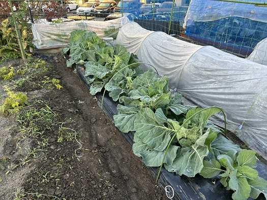 レタス類の畝にはビニールトンネルで保温をしましたが、キャベツにはしていなかったので、保温をすることにしました。防虫ネットを剥がし、通路の雑草を手入れ。