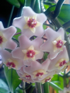 母が咲かせた「ホヤ」(正式名不明…全体はこんな感じ。(まだ伸びようとしてる…確かに珍しいですよね,こんな花(咲きかけガラスに浮かべてみました。こんもり(なんかアイスっぽい…