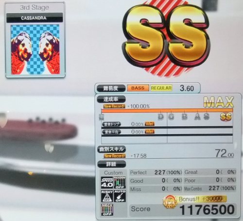 新曲も一通りやったので、旧曲でスキル伸ばしを始めた昨今。ドラムのスキル対象曲の筆頭にunder control紫が来てしまってビックリ(^^;。Through the 略が調子悪すぎただけなんですけどね(死それでも、久しぶりにやった10,000,000,000紫が、ゲージ余裕で完走できて2度ビックリ。やっぱり、ハイハットの落差を落とすと、かなり楽に叩けて良い感じです。あとは、バスのドコドコの精度が上がってくれればなぁ(ToT)。ところで、Restart赤が全然クリアできないんですが(ToT)。より成果があったのは、ギタフリの方でした。ゴーイングマイウェイ黄ギター 初S!サビ部がほぼ繋がる軌跡。AREA51の黄ギター グレ8でフルコン。Green Limeの黄ベース 初フルコン!後半の3連符地帯の「ででででででん」が繋がる奇蹟が起こった後は、ガクブルモードでしたが、チキンも発生せず、何とか最後まで耐えました(^^;。ここで集中力が切れたのか、直後のフレンズ赤をブツ切り(死ただ、オルタ系の調子はなかなかでして、DESTINY赤ギターもクリアに成功。XG2の時よりは余裕がありました(^^;そして、調子に乗ってやったThrough the 略の赤ギター。何と、初完走に成功しました\(^o^)/途中、ゲージが残り1mmまで減りましたが(滝汗オルタ系の曲は、成績を気にしなければ楽しいですね~(^^;。星のすみか赤ギターも、Cとか出てますけど、結構やってます(笑あとDDRX3。全てDPです。我がホームはジョイントプレミアムなので。猫又MasterのTribeがカッコいい!しかもDP EXPERTでも、私にもクリアできるくらいお手軽難度なのがいいですね。そして、EXTRAでやったUNBELIEVABLEもカッコいい!ライフ4つしか無いので、BASICでまったりとやったんですが、速いので意外とまったりできなかった罠(^^;。同じくEXTRAでLOVE SHINE BASICをやってみたら、初めてAAAが出ました\(^o^)/116-43-2 (MARVELOUS-PERFECT-GREAT)ぶっちゃけ、私にはPERFECTのタイミングとMARVELOUSのタイミングの差ってわかりません(←ともあれDDRは、難曲はもうどうでも良くて、簡単な曲を綺麗にプレイして、かつダイエット効果があればそれでいいかなと(^^;。