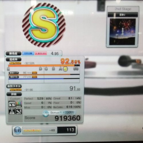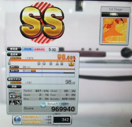 DMではLV4フォルダを、GFではLV3フォルダを順番に埋め立てているのですが、数が多すぎて苦戦しております(^^;。ただ、このくらいのレベルだと私でもたまには繋がるので、基礎に立ち返るには良いのかも知れません。パフェ率も上がったような......(ウソクセーそして、ドラマニ側では初めてSP5500を超えたので、念願の桃艶ネームになりました。今後は、艶めかしいプレイを心がけます(←?以下、昨日今日での主な成果。(主にスキル上げに寄与した曲)●Restart赤ドラム初突破!Cでしたが、それでもスキル対象になりました(笑ドコドコをしながらのシンバル3連も鬼門でしたが、私の場合はそれよりも、HH+SNとBの交互が苦手なことが問題でした(爆このタイプとスピードの16分(?)裏バス苦手なんですよ。紫Funkyくらい速ければ、表で踏んでも繋がるし(蹴SN+CYとBの交互は比較的できるのですが、SN+HHとBの交互が苦手なのは、何かフォームが違うのでしょうか。ともかく、いつもここで全体のリズムが崩れていたので、手だけ合わせて裏バス無視しました(殴それでもゲージ半分くらいは残っていました。ただ、シンバル3連地帯って結構しつこく来るんですよね(^^;。後半は体力と集中力切れのため、ゲージ残り1cmまで追い込まれましたが、何とか生き残りました。なんか紫Funkyより疲れましたorzちなみに、ひっそりと青もやったら、サビでLCとHHを1箇所叩き間違えました。グッド0だったので余計悔しいorz●Funky Sonic World紫初B(弱達成率が初めて65%を超えたという、レベル低い話ですみませんorzでも高難度曲は、3.23%更新しただけで、SPが6.01も上がるから美味しいですね(^^;。●Through the fire and flames紫ドラム記録更新達成率72.26%と、Aまであと1歩というところまで来ました。ドン亀のような上達速度です(汗この曲なら1曲目でも躊躇うことなく選曲できるようになったし、連奏もできるようになりましたので、少しずつは進歩していると思いたい(^^;。●ゴイーイング マイ ウェイ!赤ドラム初S久しぶりにやってみたら、達成率が78.47%→89.50%まで上がりました。これは接続も視野に?(ぇ●群青と流星赤ドラムで、6.86PTの更新。左足刻み地帯に慣れてくると稼げます。現在、78.52%なので、頑張ってS取りたいですね。●アーリマン赤ドラムで、達成率77.77%に(笑こちらもなかなか稼げるのですが、ライバル登録者たちは普通にSを取得されているようで、正直、勝てる気がしない曲の一つです(^^;。●Going Up解禁!赤ドラムも赤ギターも稼げるという名曲名譜面です\(^o^)/例によって刻みはキツイですけどね(^^;。それ以上に、相変わらずBメロのタムがよくわからんorz●魔笛の紫ベース、やってみたらA(78%)まではできました。SP的にもかなり美味しい!中盤3連符地帯ラストのバラバラっと来るところだけはグロいですけどね(^^;。あと、four-leafの黄ベースはかなり左右に振られるし、3.90じゃ効かないと思います!SS取りましたけどね:-Pあとは、ライバル登録者も同じようにLV4台の曲埋めをしている(であろう)ため、熾烈な争いになっている曲が時々あります。秋風黄とか、全員がSSって凄いな(^^;。一番面白かったのは、spectrumのドラムでしょう。黄色では(昨日の記録ですが)、95.41%で僅差で、(珍しく)さんちぇさんに勝利。一方、赤では負けました。なんと0.01%差で!高速刻みが楽しいので頑張ります。そういえば復活曲では、モラトリアムの赤ドラムがテクニカルで、左足がはまると楽しいです\(^o^)/成績は70%にも届かない悲惨なものですが、まったり頑張ります(^^;。