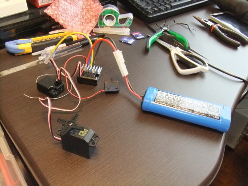 さらにさらに昨日の続きです。オイルダンパーとステアリングアームが付いたところまででした。今日でいよいよ、シャシーの完成です!27.ラジオコントロールメカを取り付ける前に、受信機にバッテリーとステアリングサーボを付けて、動作チェック兼サーボのニュートラル位置の確認をします。28.サーボステーを取り付け、ニュートラル状態で真ん中に位置するようにします。29.ステアリングサーボをステアリングアームに取り付け、シャシーに固定します。30.ESC(Electronic Speed Cotroller)と受信機、ON/OFFスイッチを取り付け、モータと結線し、余ったケーブルをナイロンバンドで捕縛します。これで、ラジオコントロールメカが付きました。プロポからの電波を受信すればモーターは回るし、ステアも曲がります。31.でもまだ、タイヤがついていないのでした(^^;。組みましょう。32.タイヤにホイールをはめ込み、間に瞬間接着剤を流し込んで接着します。33.接着剤が乾いたらいよいよタイヤをシャシーに取り付け、バッテリーを積んで完成です!\(^o^)/ということで、TT-01Dシャーシが完成しました。もうこれで走らせることもできます。ところで、本記事はBRZのラジコン作成記なのでした。ボディが付かないと、とてもBRZには見えませんね。ということで、ボディ塗装とラベリング編に続きます。お楽しみに~(^^)ノシ