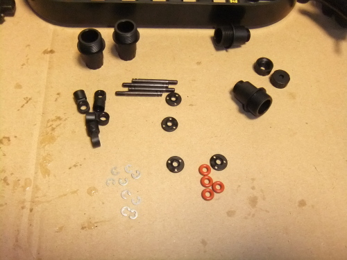さらに昨日の続きです。前後輪ともに、駆動力が伝わる所まで作ったのでした。続いて、オイルダンパーを作って取り付けます。20.こちらが材料になります。写すのを忘れましたが、あとシリンダーの中に入るダンパーオイルがあります。21.シリンダーにピストンロッドを通します。前後2個ずつ、計4個作ります。22.ダンパーオイルをシリンダに居れ、オイルシールをはめ込んでから蓋をねじ込みます。オイルが溢れないように量を調節するのがなかなか難しい作業です。23.コイルスプリングをはめ込んで、オイルダンパーの完成です。24.リヤ側にダンパーを取り付けます。25.続いてフロント側にもダンパーを取り付けます。ついでに、ウレタンバンパーも取り付け、いかにもフロントらしくなりました。これで、オイルダンパーが付いたので、路面からの衝撃を吸収できるようになりました。タイヤが繋がれば、「走る」&「止まる」機能は既に完成しているので、車にあって、これにまだ実装されていない機能は何でしょう?「曲がる」機能がありませんね。ということで....26.ステアリングアームを取り付けます。ここにステアリングサーボが繋がれば、ハンドルが切れるようになるというわけです。さて、次回はいよいよ、ラジオコントロールメカを取り付け、シャシーが完成します!お楽しみに~(^^)ノシ