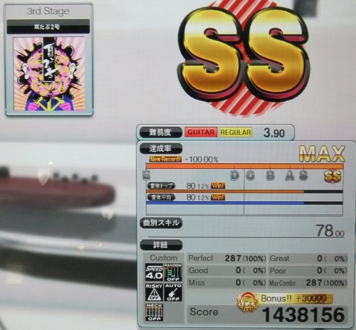 遂に、ギタフリでもSP5000を超えて、毒色ネームになりました\(^o^)/解禁曲が、それなりに稼ぎになったので助かりました。チカラ赤G、タイムカプセル赤G(更新)、双つ雲と暁の奏赤B で更新。双つ雲と~の黄Gはグレ2でした。惜しい。あと、White wings黄Gが意外と稼げるのですが、終盤のオルタ地帯は相変わらずボロボロでした(死ついでに、under control赤Gを初クリアしましたが、速いし左右に振られるしで、よく生きてたな~と思います(^^;。成績?Cですが何か(死なお、双つ雲と暁の奏のドラムの方はと言いますと......青:フルコンでSS。簡単。黄:S。それなり。赤:即死(爆同曲のマッチング、赤ドラムも結構いましたが、死亡率高かったですね~(^^;。ギター側は楽しいし楽なんですけどね。ベースは終盤の3連階段が厳しいです。そんなわけで、ドラム側はSPがすっかり伸び悩んでしまったので、ネタに走ってみました。副産物として、DD7赤がスキル対象になりました(笑