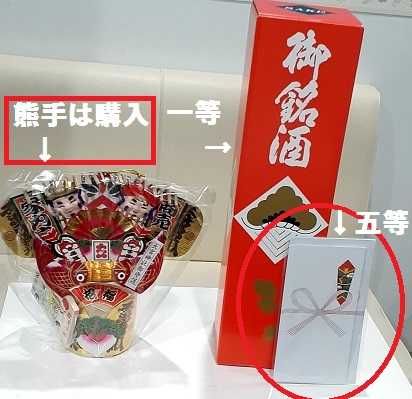 お友達が『宵宮恵比寿』行くから一緒に行こうって誘ってくれたので近くの神社に行ってきた婆ちゃん『熊手』買ったら二枚福引券くれたんだって友達曰く何枚もらっても一枚も当ったこと無いから引いてって頼まれたらしい一回目廻して出た色は白当然ハズレの五等です・・・二回目巫女さんに左に廻してもいい?巫女さん首かしげてた^^ガラガラ廻したらコロンと落ちた色水色白の上かなって思ったら巫女さん『え』婆ちゃんもえ巫女さん『ええええ え』『一等です 』えええええ~驚きの婆ちゃん巫女さん達も驚いてた・・?なんで婆ちゃん::「運 使い はたしたぁ」っと思ったらしいこれから運が付くんやと友達が言ってくれたんだって後 恐いわ・・ 一等のお酒 爺ちゃんが喜ぶ品物や一人だけで 呑んだらあかんと思う・・こういう物は分け合わなあかんでいつもありがとです(テモ)