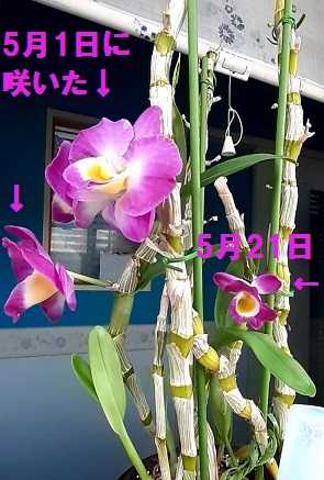 5月21日に咲いてた花見ると花が下に落ちてたですよく見ると5月1日に咲いてた3つの花も2つになってるでもまだ まだ咲いてくれてるですいつもありがとです(テモ)