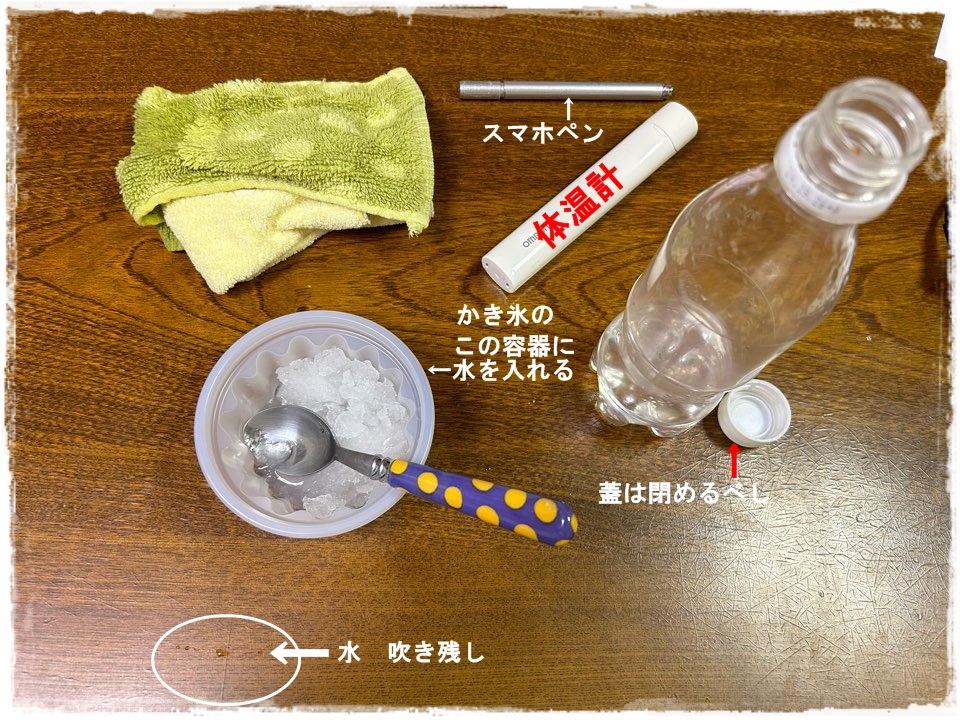 毎日暑い日が続く溜息ため息タメ息そうだ『かき氷』食べよっ と 婆ちゃんはかき氷が好きです半分残してお水を足す食べ方をするです蓋を開けてかき氷半分とって水を入れてるペットボトル取ろうとしたらペットボトルが倒れた!本当は婆ちゃんがボトル倒したです!ボトルのせいにする婆ちゃんTVのリモコンノートメガネ体温計この頃毎日測ってる諸々あわてて片付けてテーブルの上(炬燵)ハンカチ、ティッシュで拭いた婆ちゃん食べるまでに時間かかったぁはぁ~これがホントの『ため息』 ハンカチ 水しみこんでるかき氷食べながら疲れたなぁ・・水こぼしたからや いつもありがとです(テモ)12才?