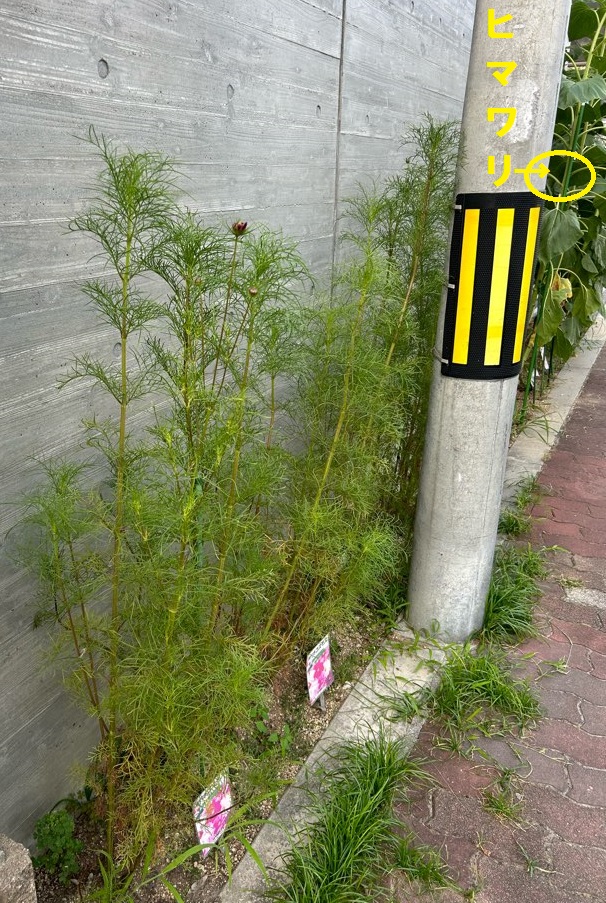 ヒマワリさんの横に咲いてる花コスモス・・・へ早すぎると思うけど秋咲きコスモス って書いてる夏 終わったんかぁいつもありがとです(テモ)13歳?
