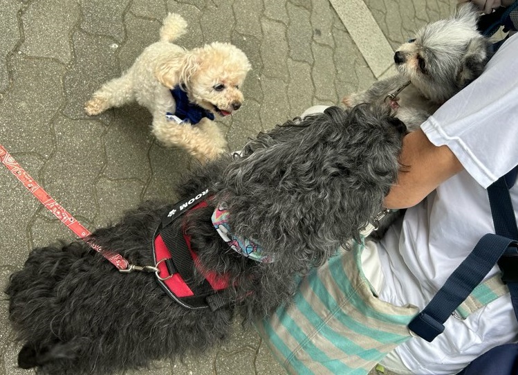 公園の中通り過ぎようとしたらワンちゃん抱っこしてる人が婆ちゃんに挨拶してくれる婆ちゃんは?・?・? わ た し ?喫茶店 〇ラ〇○ に いた方でしょうあああ~アッと思った 婆ちゃんワンちゃんをバックの中に入れてた人でした喫茶店で 話をした人 です 白いワンちゃん 抱っこしてる人の ワンちゃんのママ です抱っこしてるワンちゃんのママさんは別の人だよみんなワン語で 話してたよ最後にやってきたワンちゃん少し年齢がいってるです皆 おやつ貰うため寄って来てるいつもありがとです(テモ)11才今日も暑かったです