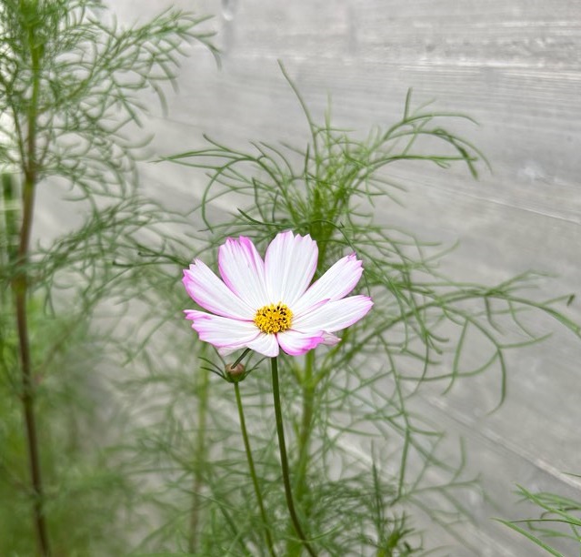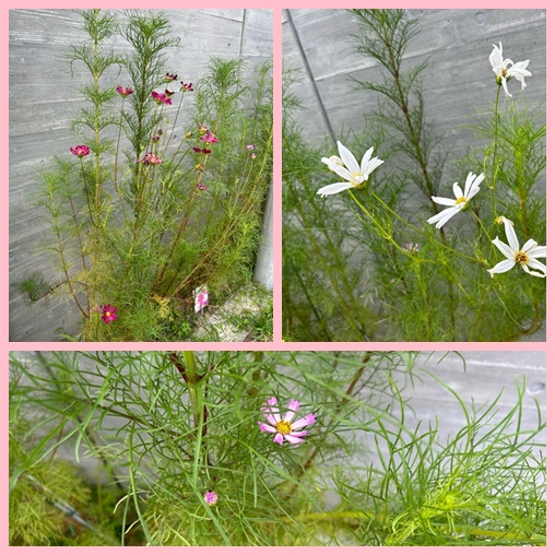 散歩したら暑くて買い物だけしたよ婆ちゃんいつも見ていたコスモスとヒマワリ赤いコスモスの隣白いコスモス真ん中が ピンクヒマワリ花も小さくなってたですアッと言う間に咲き終わったですいつもありがとです(テモ)
