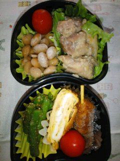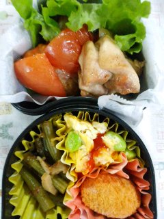 昨日は疲れたよ~。珍しくお弁当の下ごしらえをと思っていたのに、リビングで爆睡してしまったわ・・・今日のお弁当はひとつ。パパ弁当。グリーンリーフ。鶏肉とトマトのオーブングリル焼き。鶏肉、トマト、じゃがいもをフライパンで焼いて塩コショウ。それからオーブンで焼いてできあがり・・・のはずだった。オーブンで焼く前まで夜にやっておこうと思ったのに、寝ちゃったうえに朝起きるのが少し遅くて、鶏肉とトマトを塩コショウして魚焼きグリルで焼くだけになってしまった。でも残りを食べたら十分美味しかったよ。いんげんとエリンギのおかか煮。昨日の夕食の一品。えだまめ入り炒り卵。えびプリプリフライ。冷凍食品。うしゅけやみしゃおは市販のお弁当用おかずの冷凍食品を喜ばないので、あまり使わないんだけど、冷凍庫には何かしら入っている。面倒くさいので、自然解凍できるものばかりをチョイス。パパ弁当の隙間を埋めるのに活躍している。